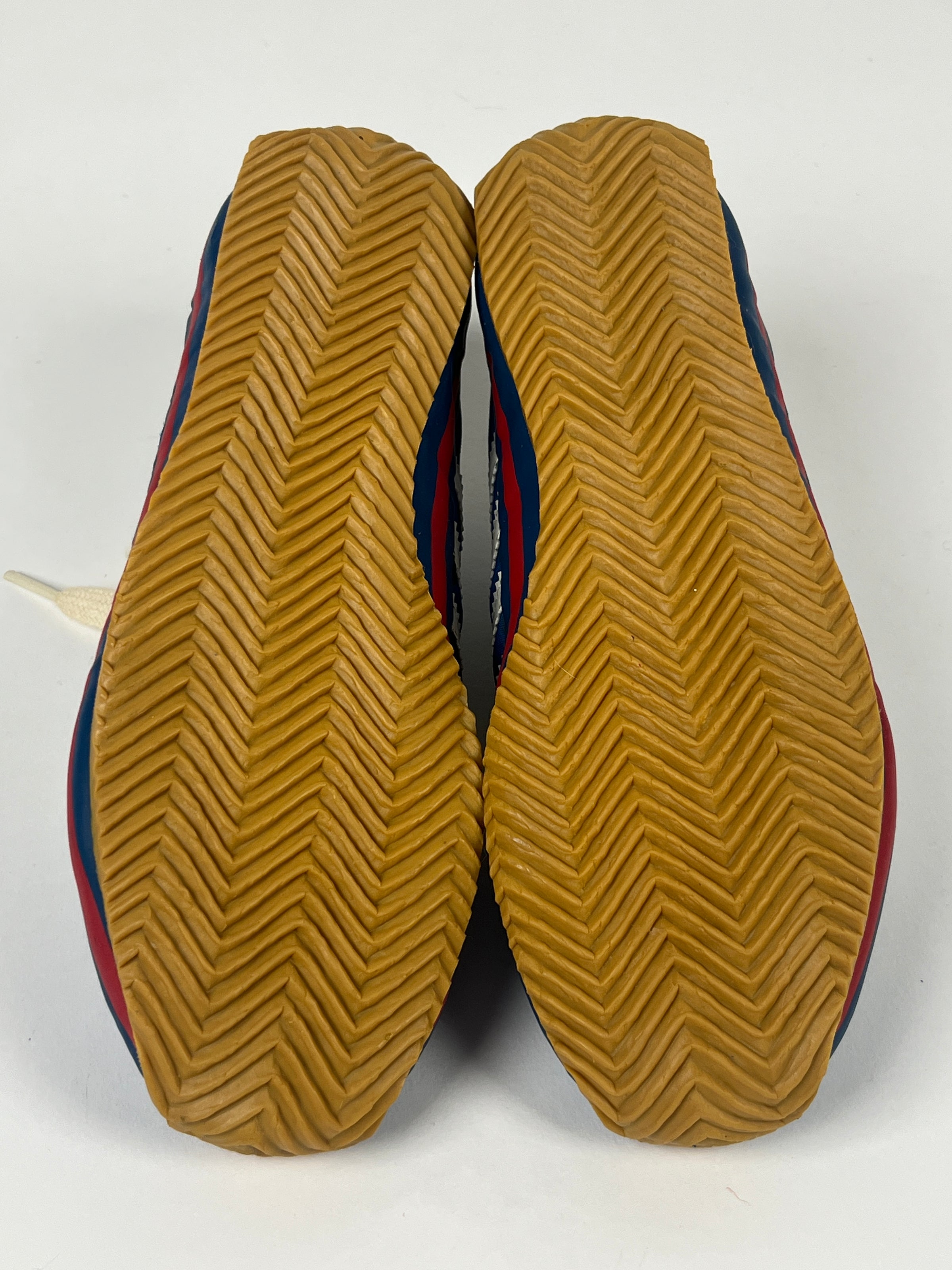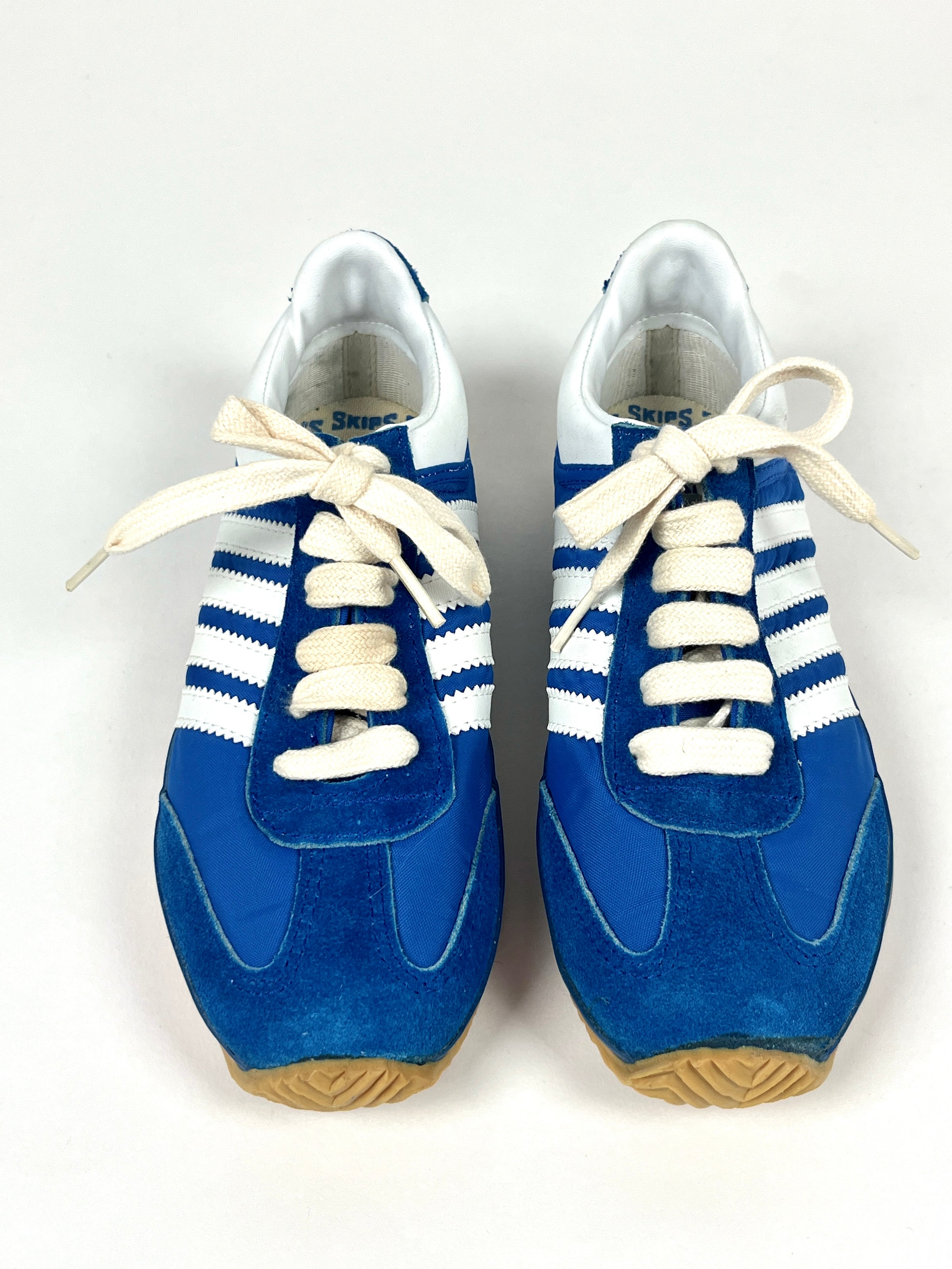 Rare pair of vintage 1970s sneakers by Skips featuring vibrant blue nylon outsole with genuine blue suede trim and genuine white leather stripes. Blue and red stripe side panels. These would be great for the costume design of a 70s-era show.