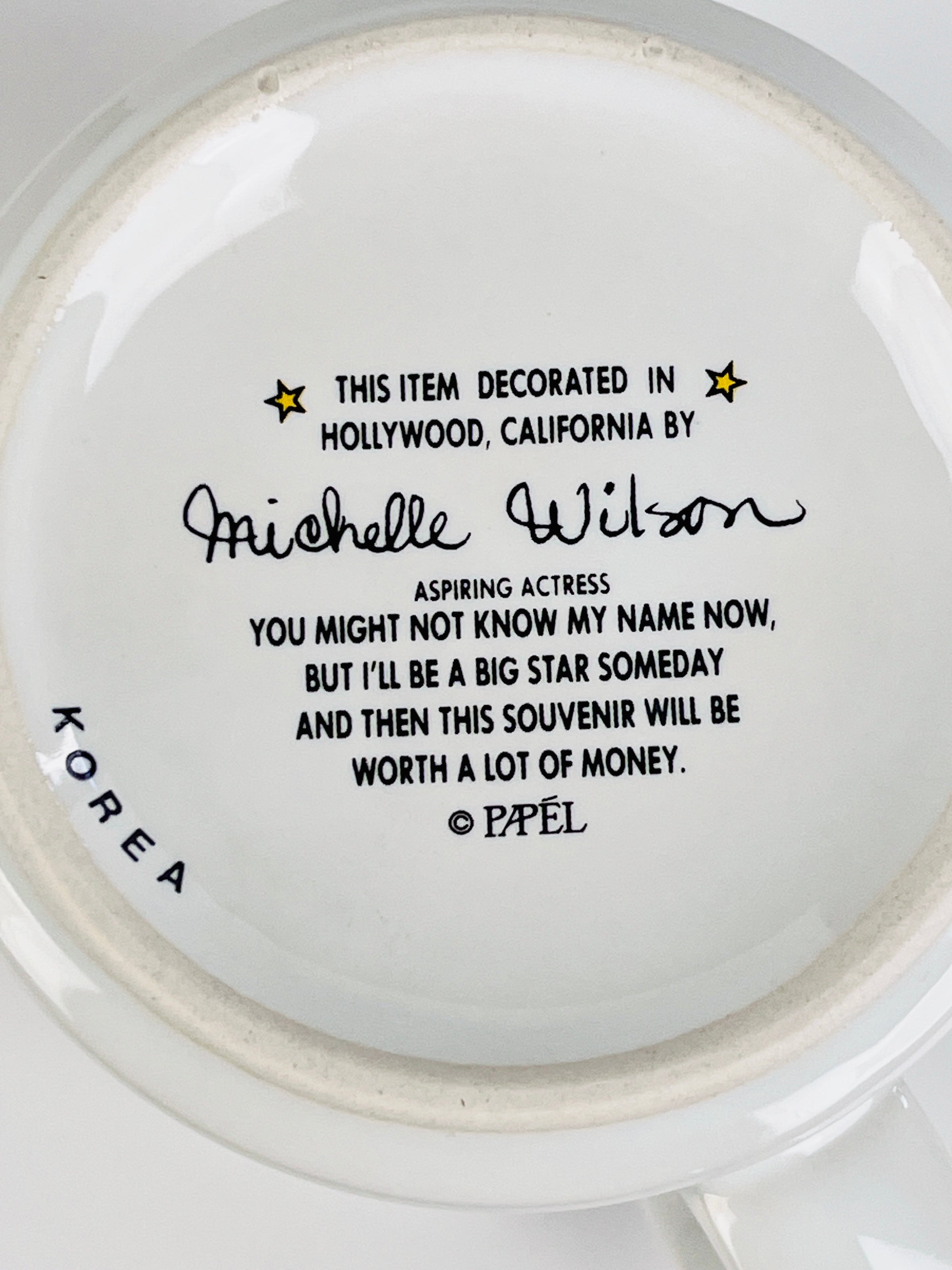 Fun vintage 90s ceramic Hollywood mug fest trying the Hollywood Hills, starry night sky, search lights, palm trees, and stretch limo. Three available, sold separately. Decorated by Alexander Smith and Michelle Wilson, who said they’d be big stars one day!