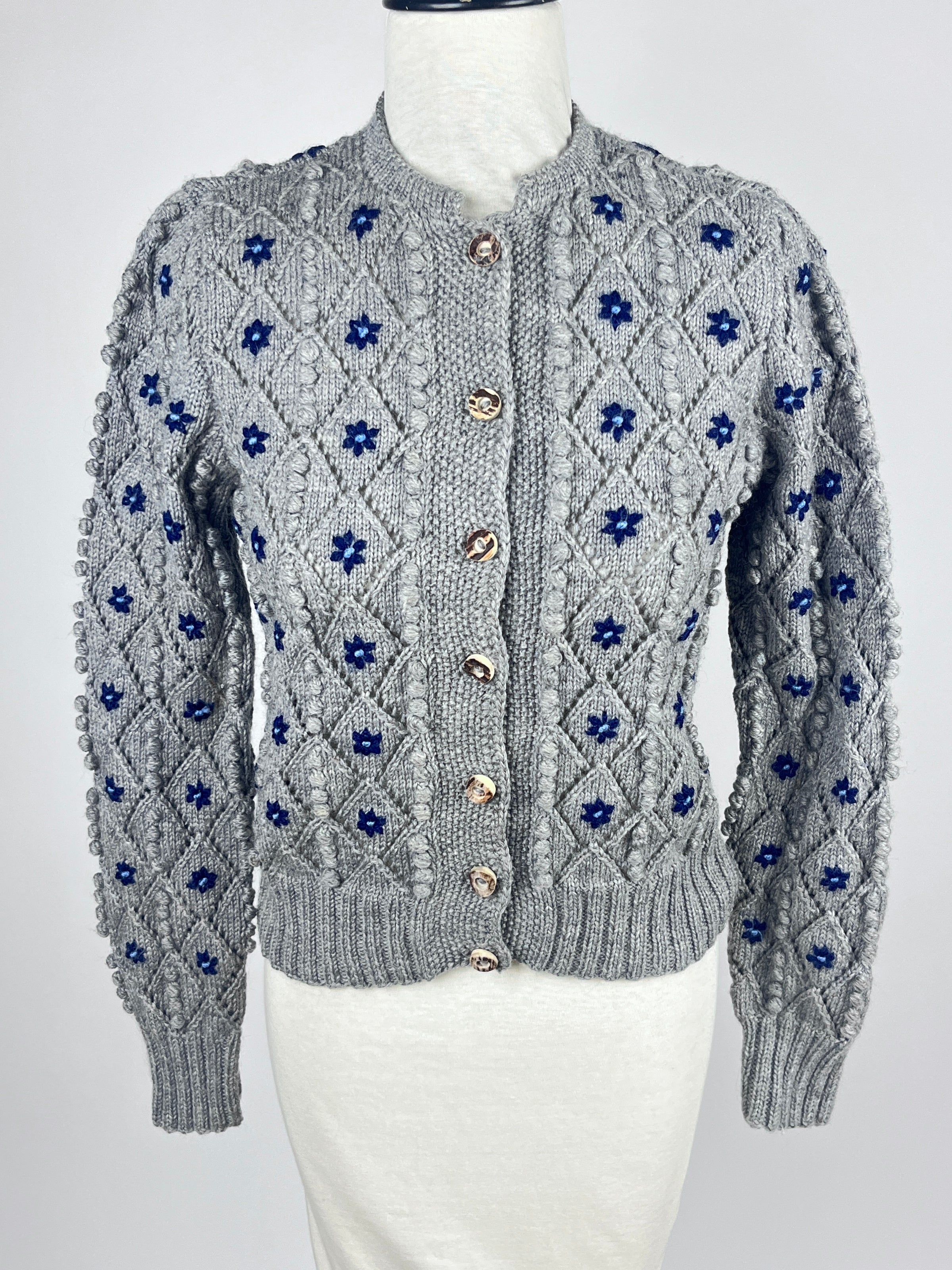 Vintage 1970s Austrian knit wool sweater by Edith Moden, featuring blue flowers against a gray backdrop. Lovely lattice and ball texture throughout. Wood button closure in front.