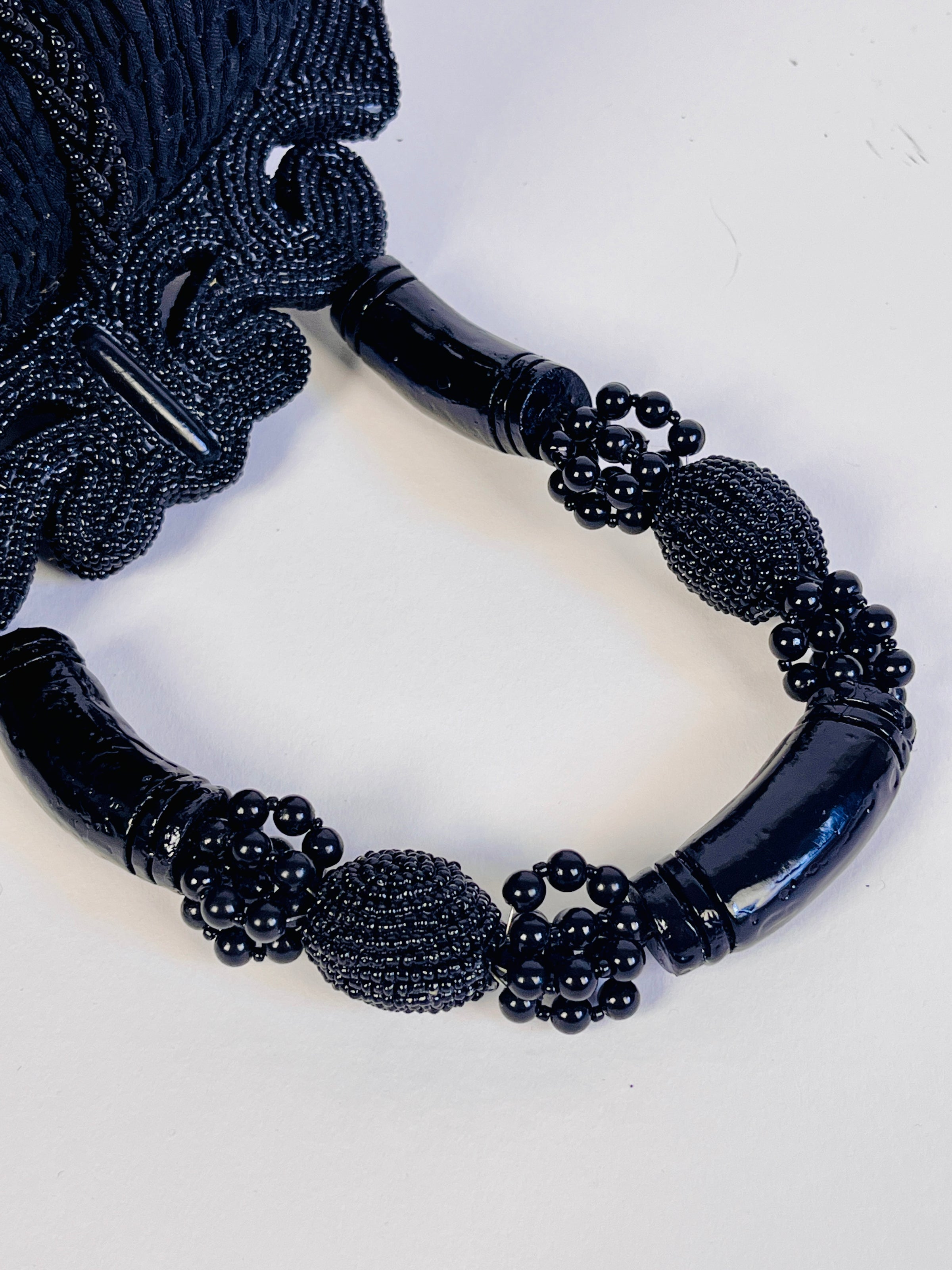 Vintage evening bag featuring structured, box purse style, black shirred fabric exterior, black beaded butterfly, black beaded top frame, beaded handle, and single beaded fringe accent on right side. Velvet-lined interior. Magnetic snap closure.