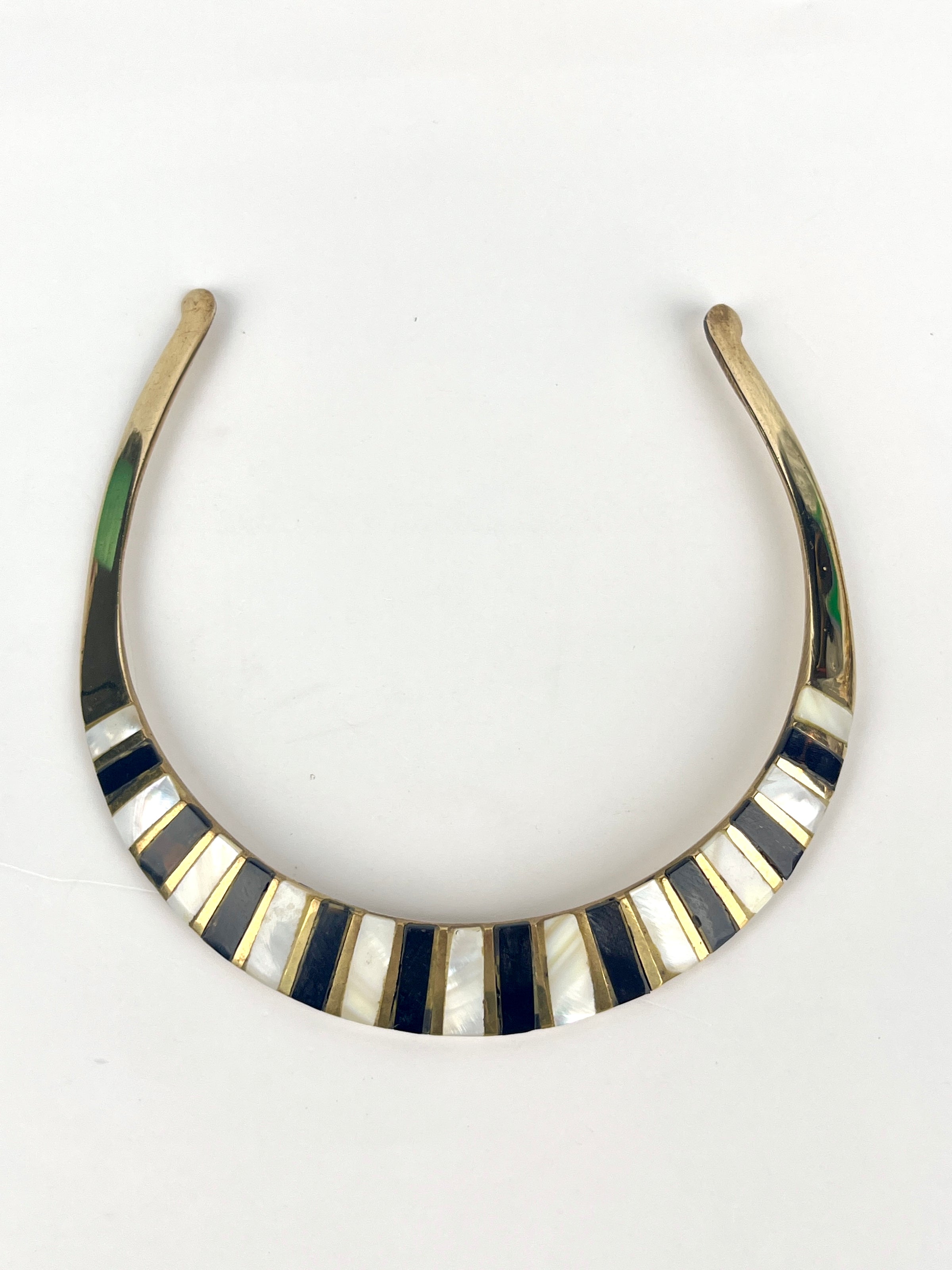 Vintage brass collar necklace with mother of pearl and horn inlay.