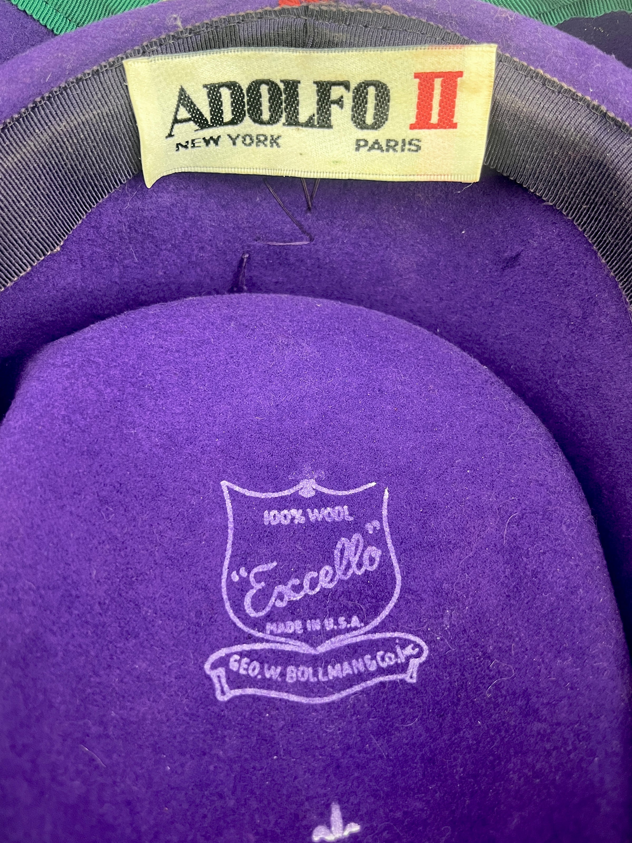 Lovely 1950s vintage wool pillbox hat produced by Bollman Hat Co for Adolfo II, featuring felted wool body in purple and large bow with green grosgrain ribbon trim.