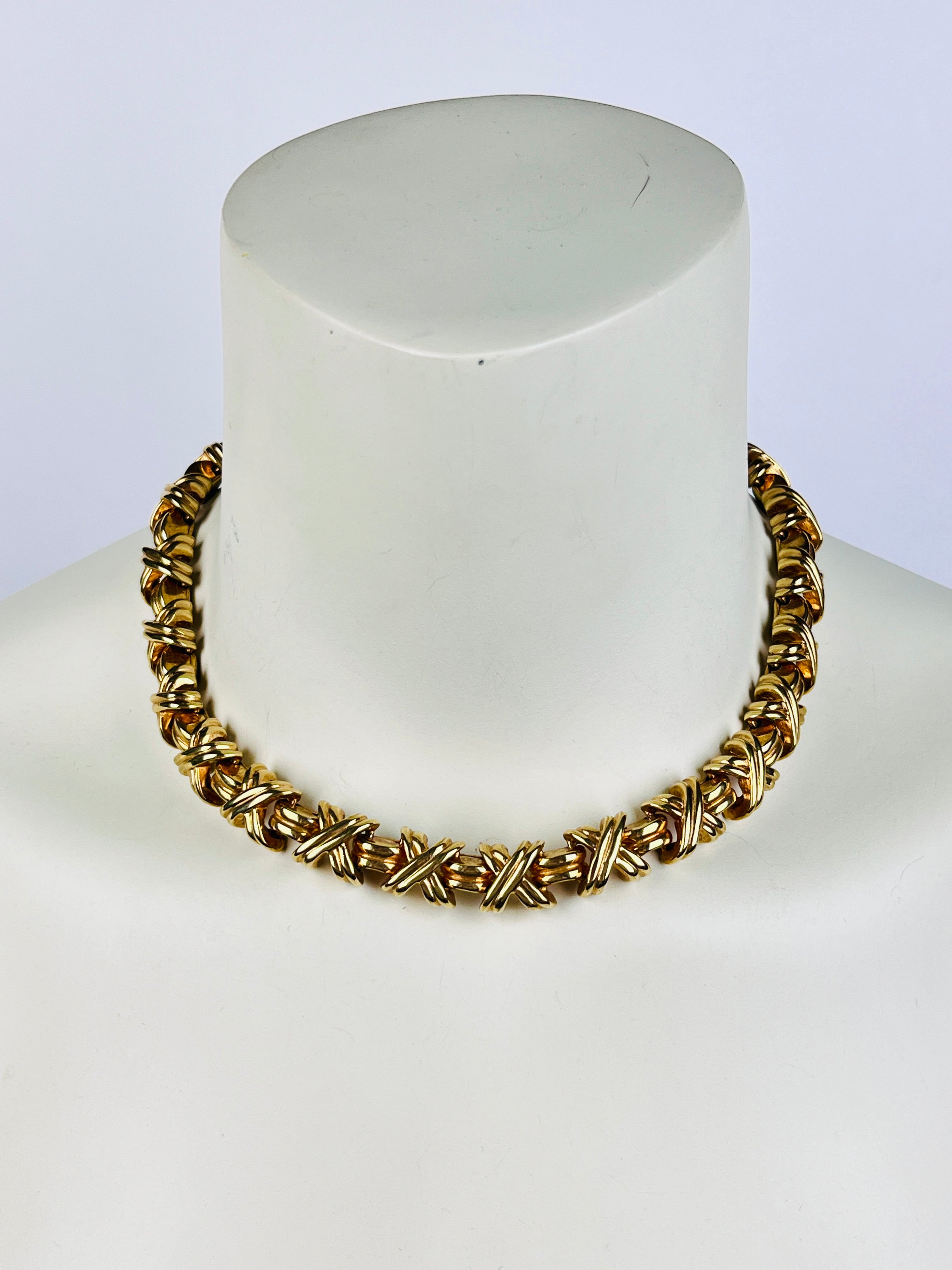 Vintage gold tone collar-length necklace with cross-cross pattern. Nice and heavy in a good way. A very solid piece.