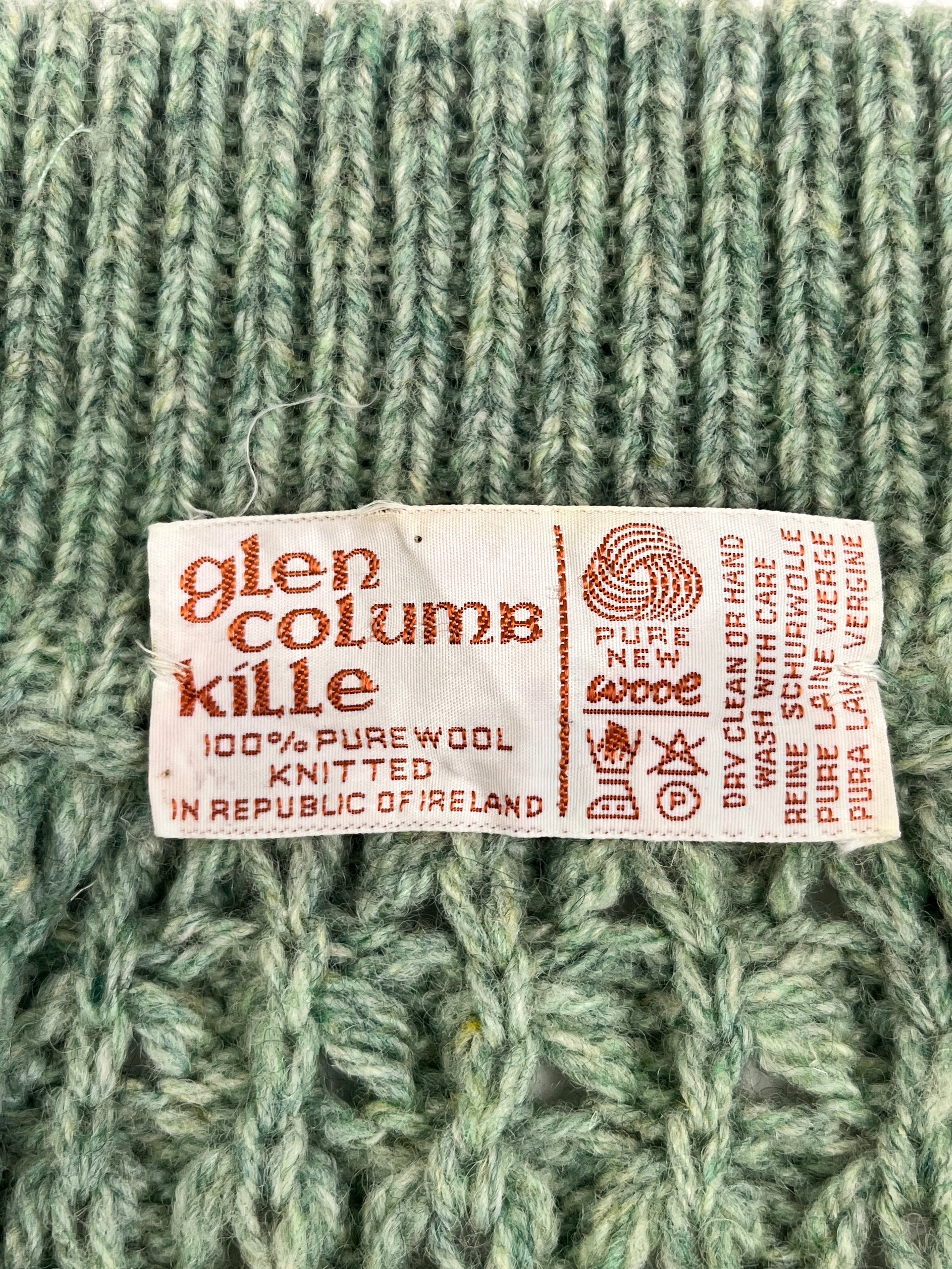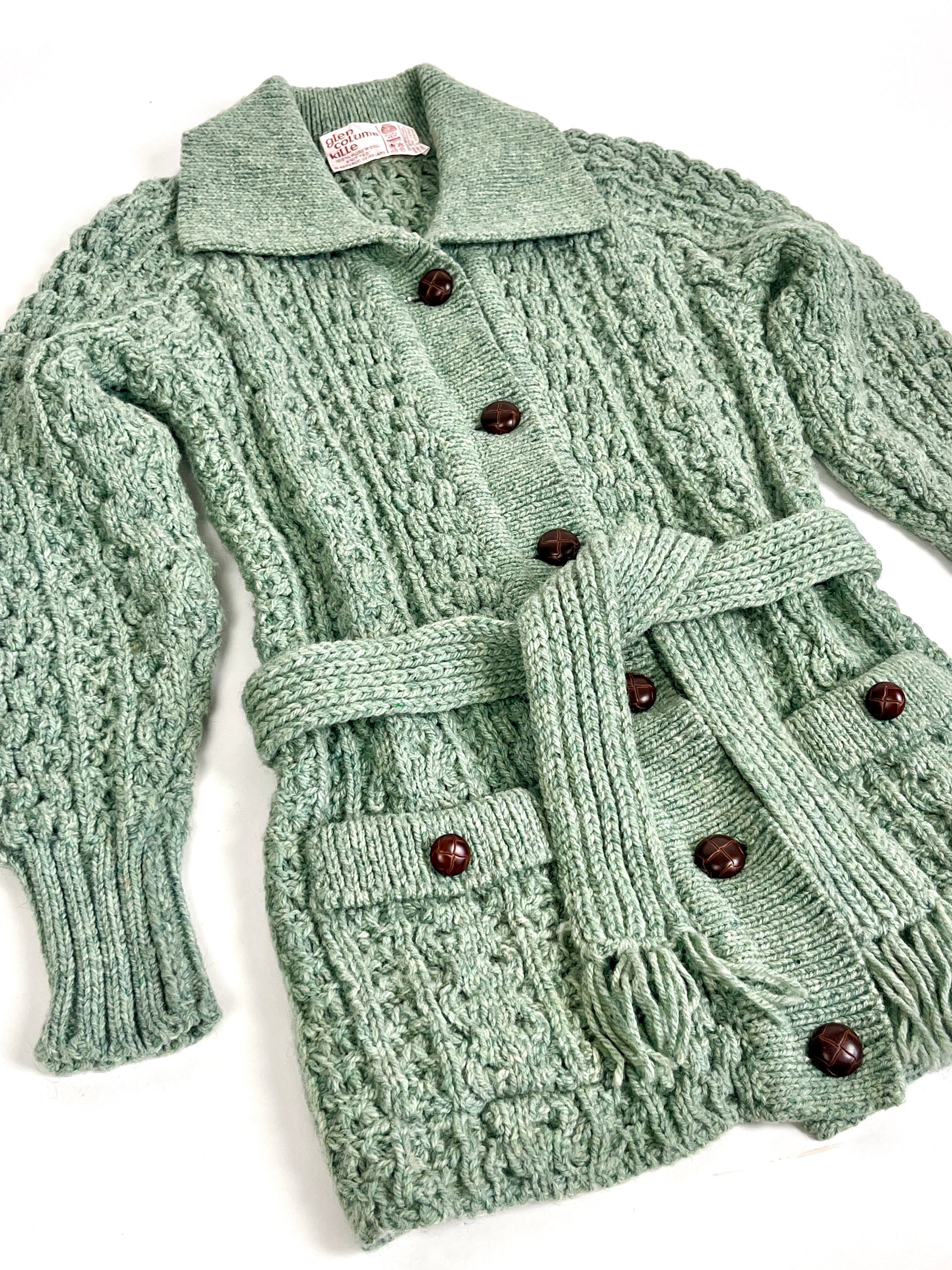 Vintage 1970s knit 100% Irish wool sweater by Glencolumbkille, featuring a lovely thick knit design, two front pockets, a knit fringe belt, and faux braided leather buttons. Made in Ireland.