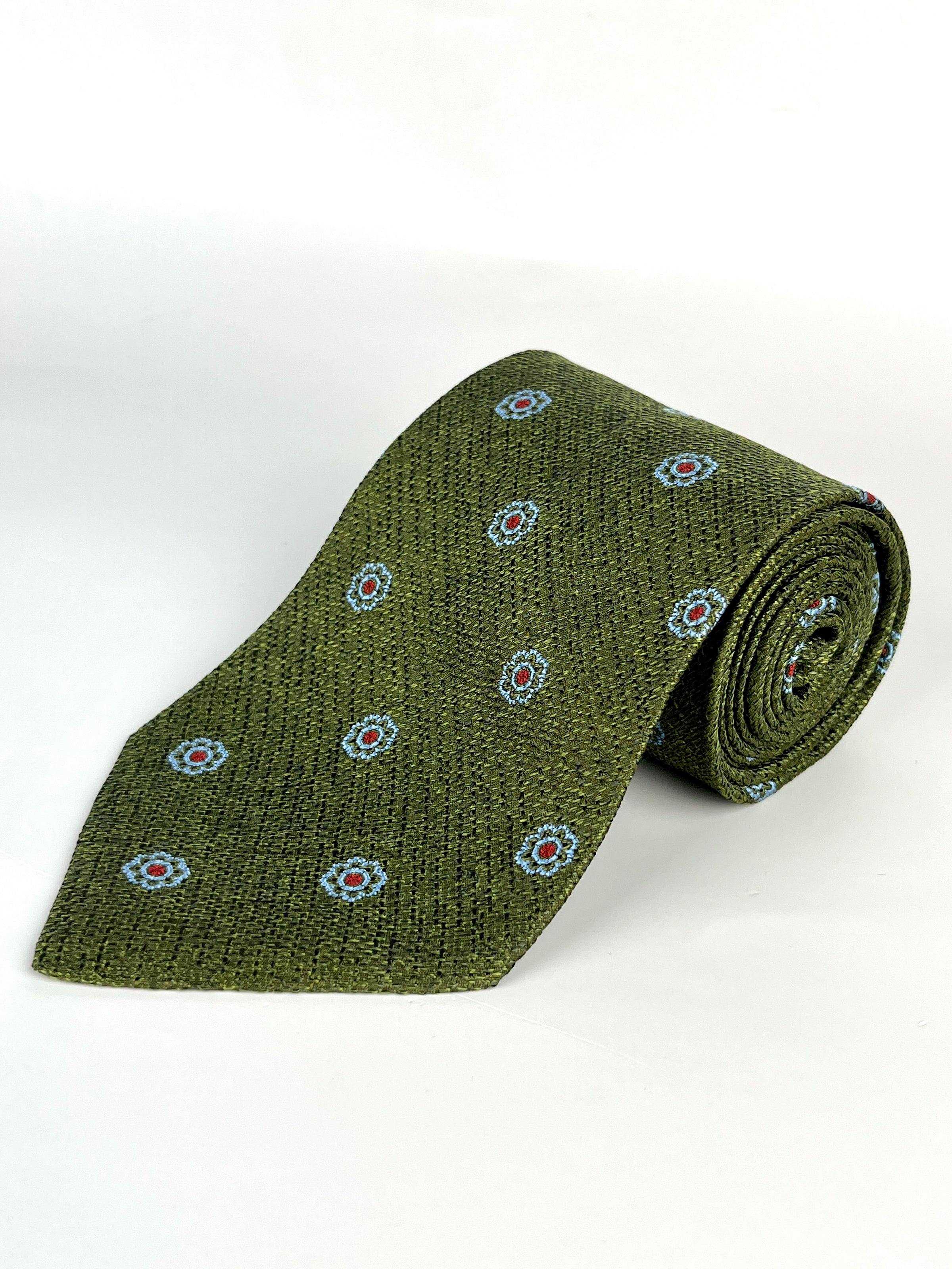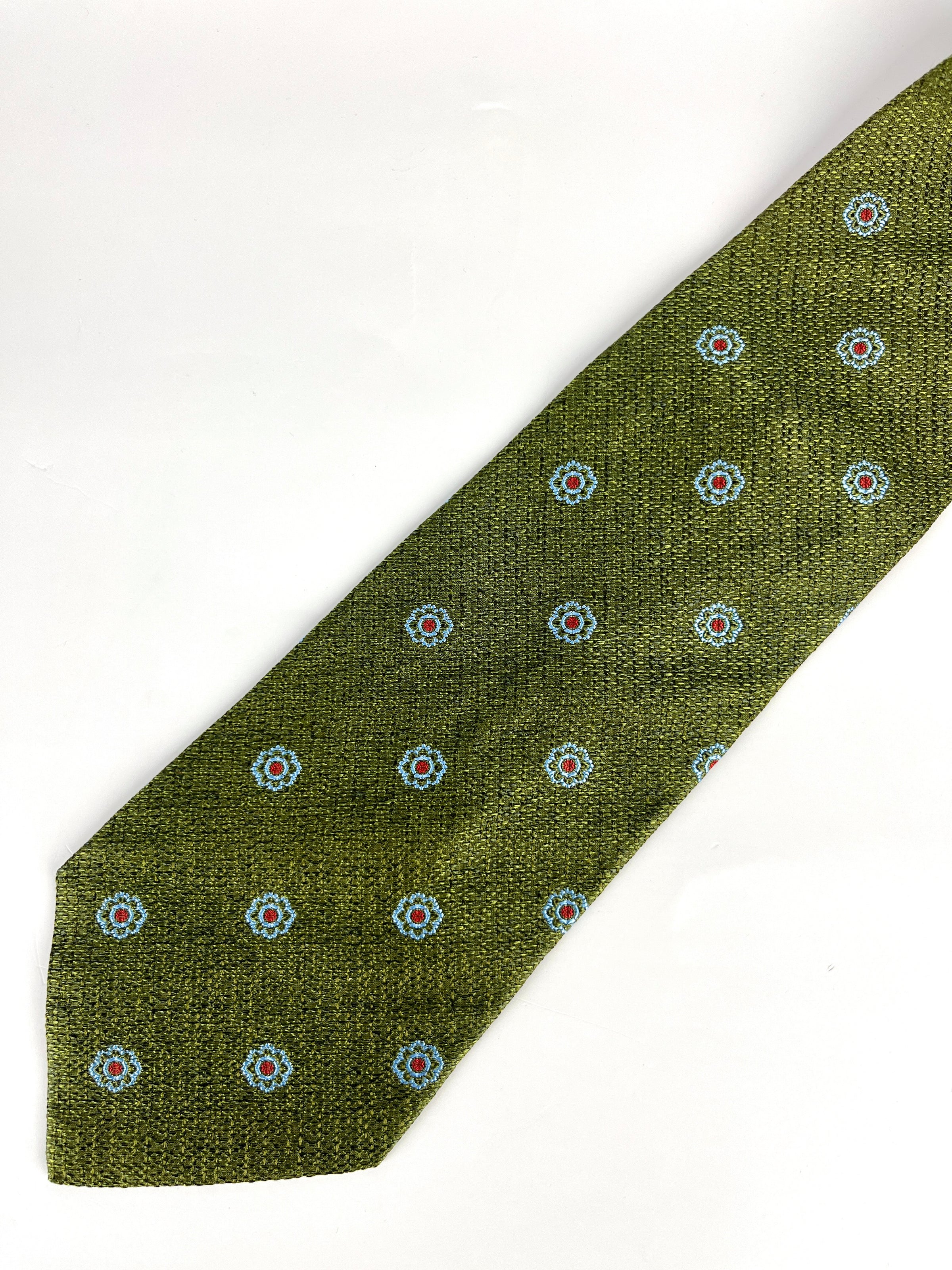 Vintage green silk tie with blue and red flowers. Made in Italy.