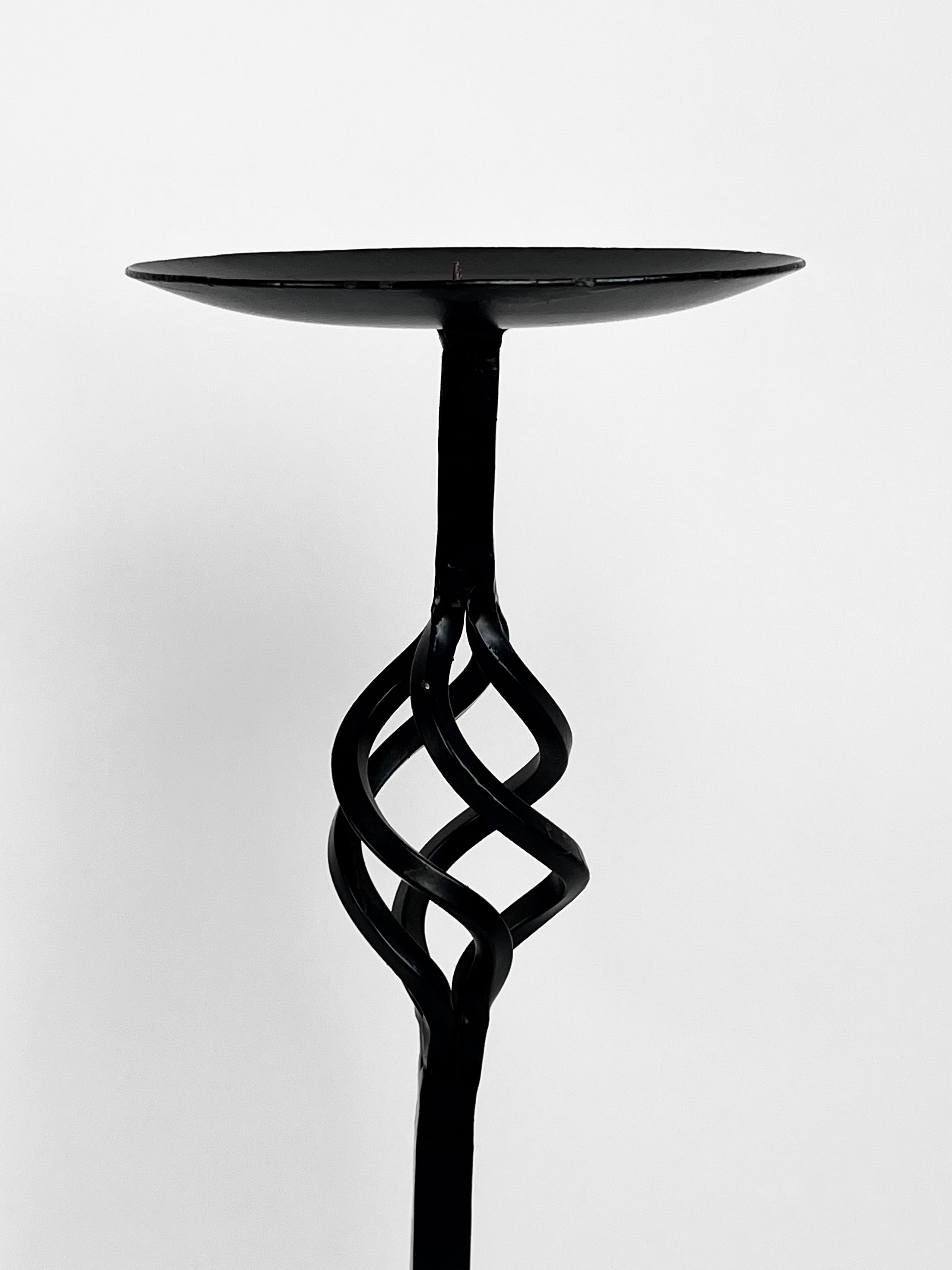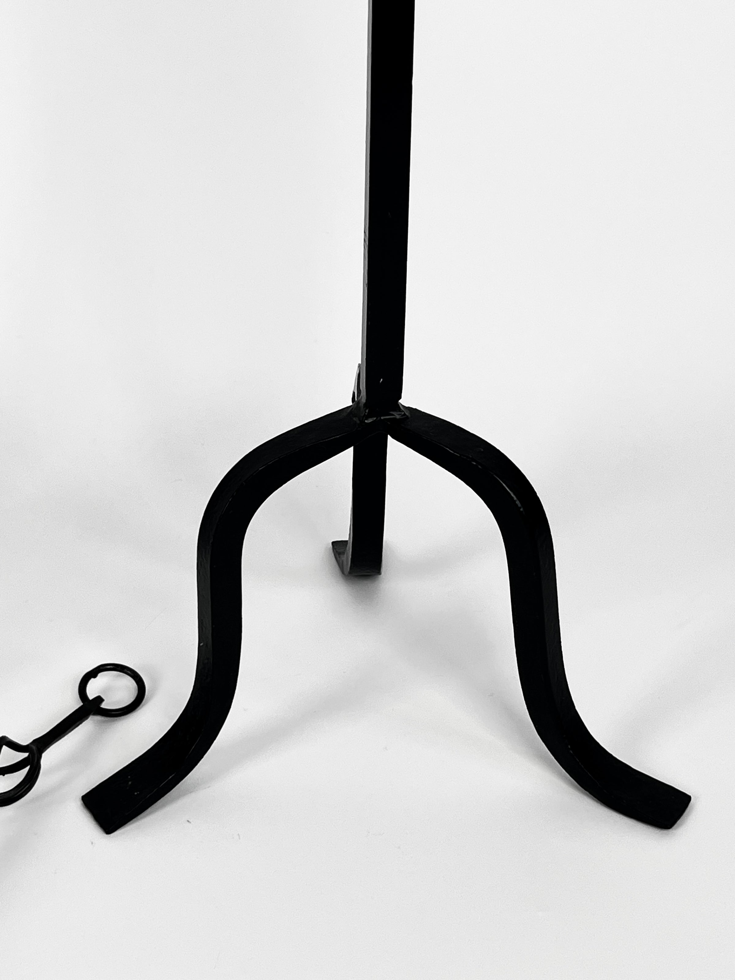 Pair of vintage late 90s wrought iron tripod candle holders and candle snuffer from Chicago’s own Montgomery Ward department store (with original Ward’s tag!) with open twist design. These tall, floor candle holders are perfect for large pillar or ball candles, with center prickets to secure the candles. The matching wrought iron cable snuffer echoes the twisted design of the candle holders and adds an elegant touch when it’s time to put out the flames. Candles not included.