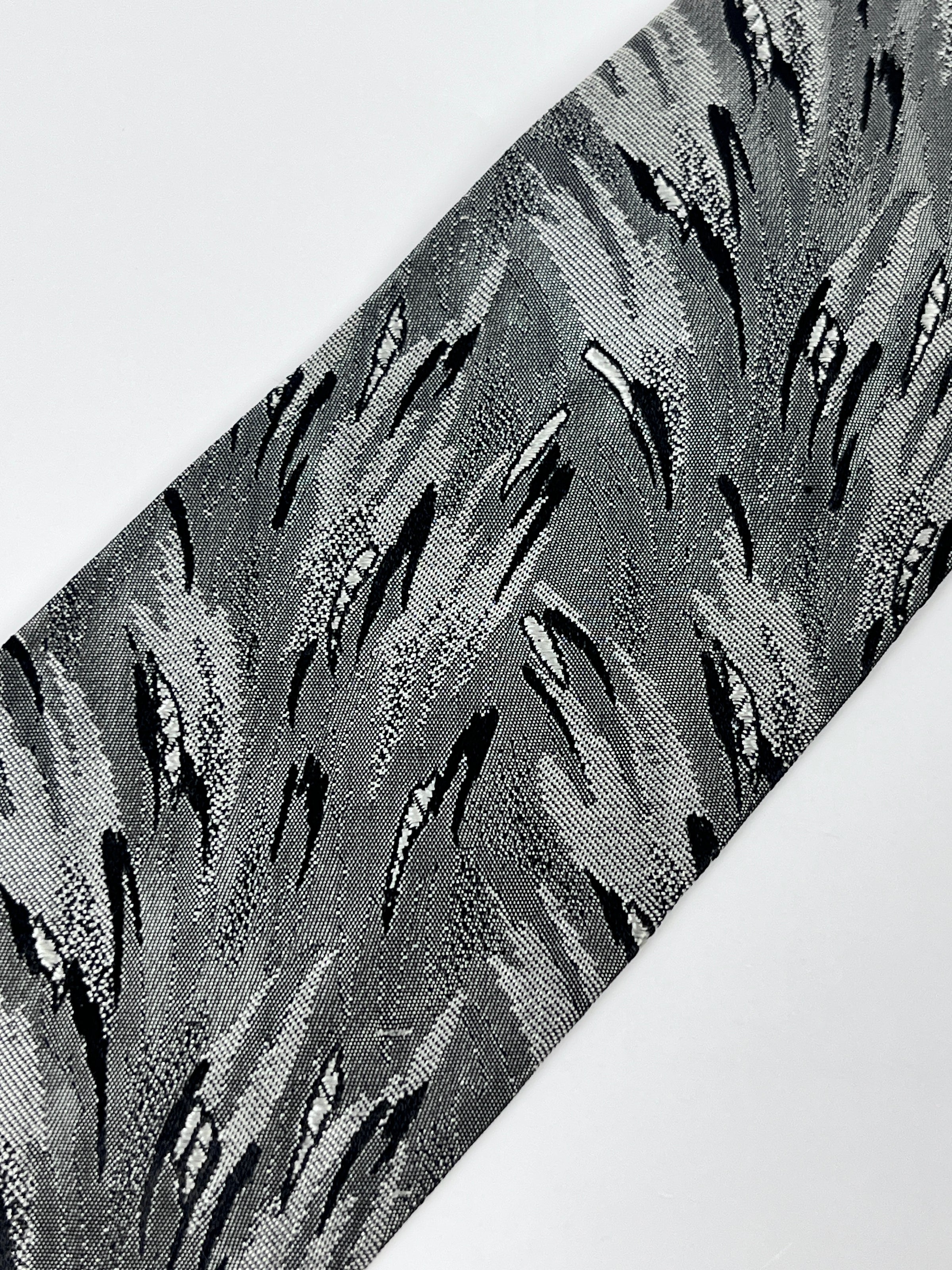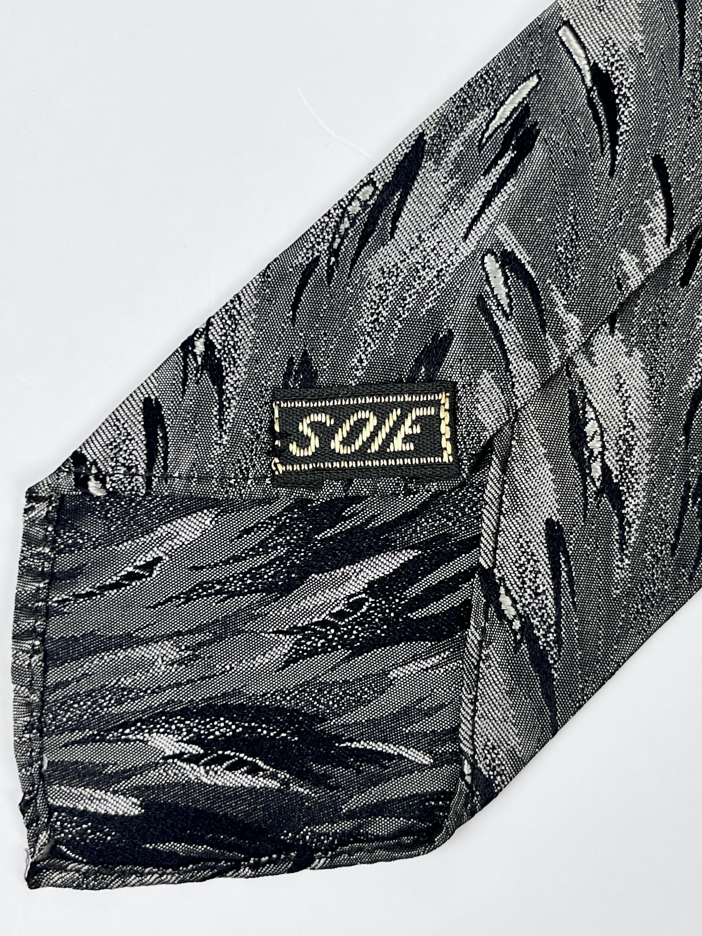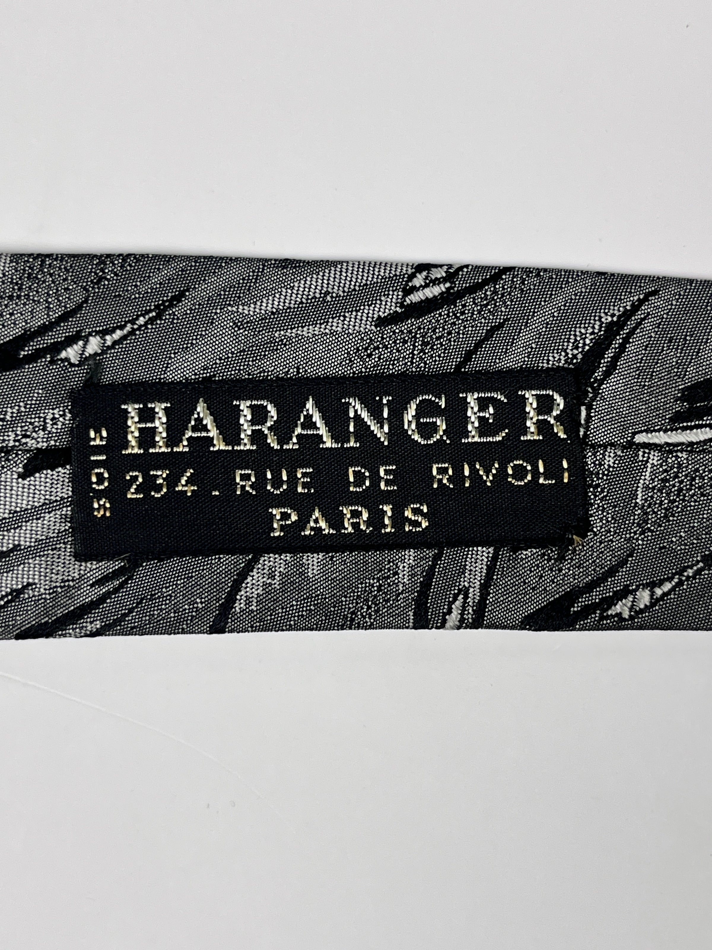 Vintage 1960s skinny silk tie in silver, gray, and black by Haranger Paris.