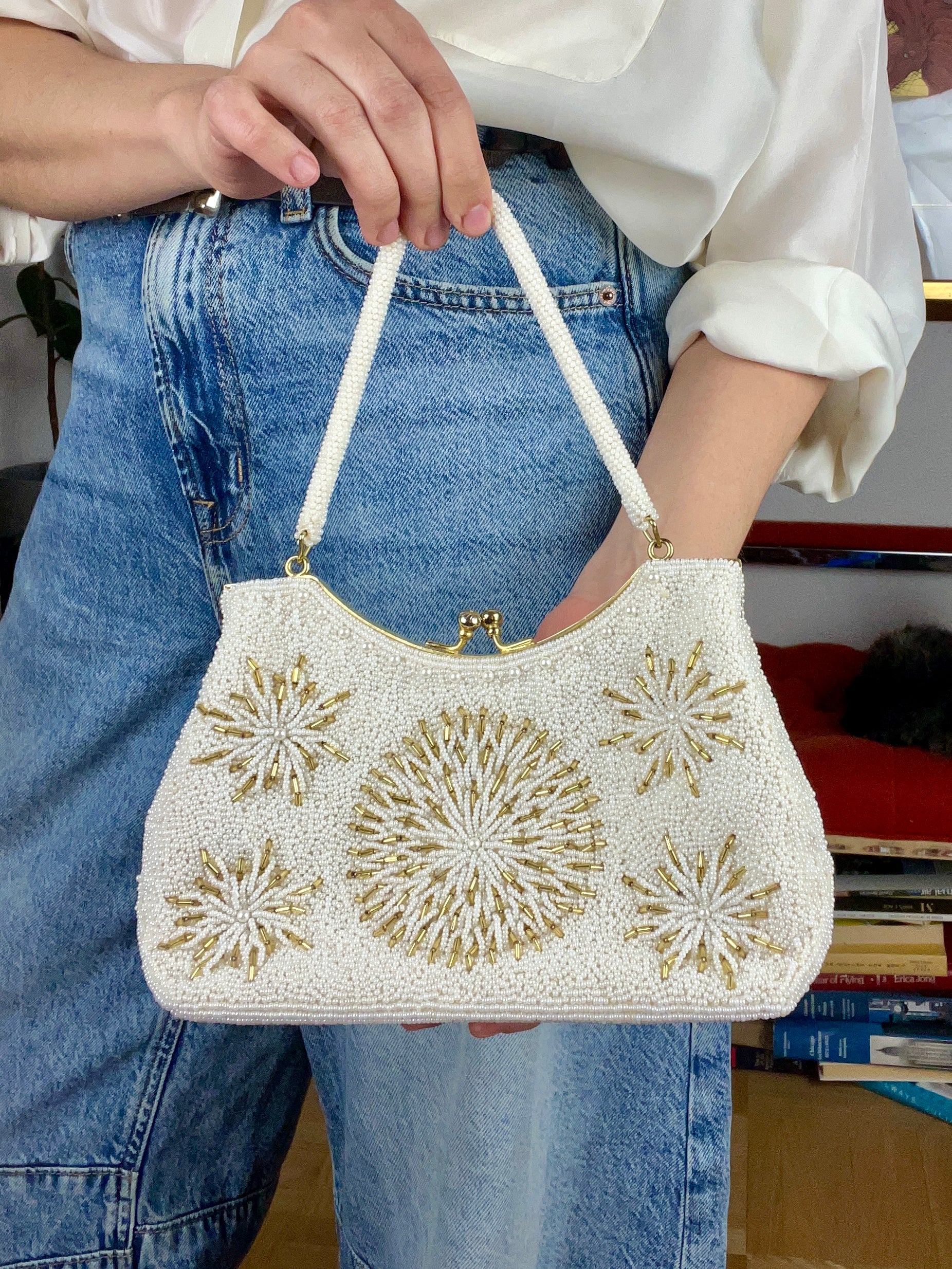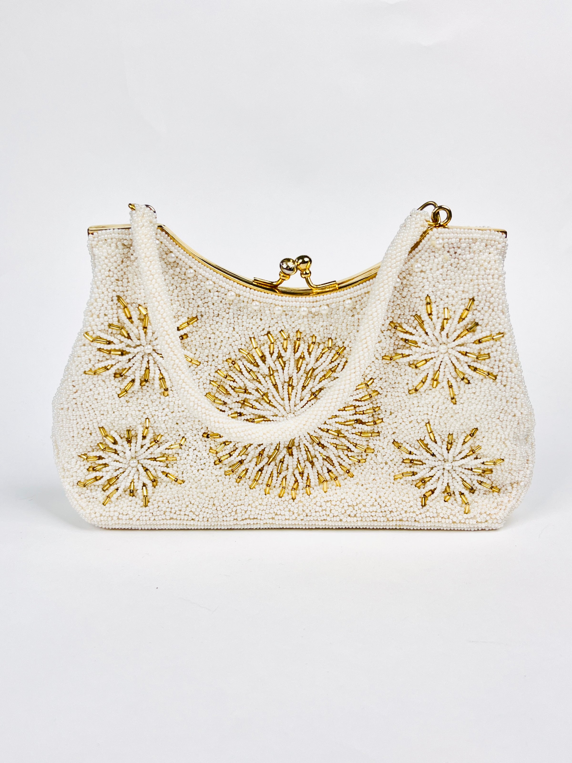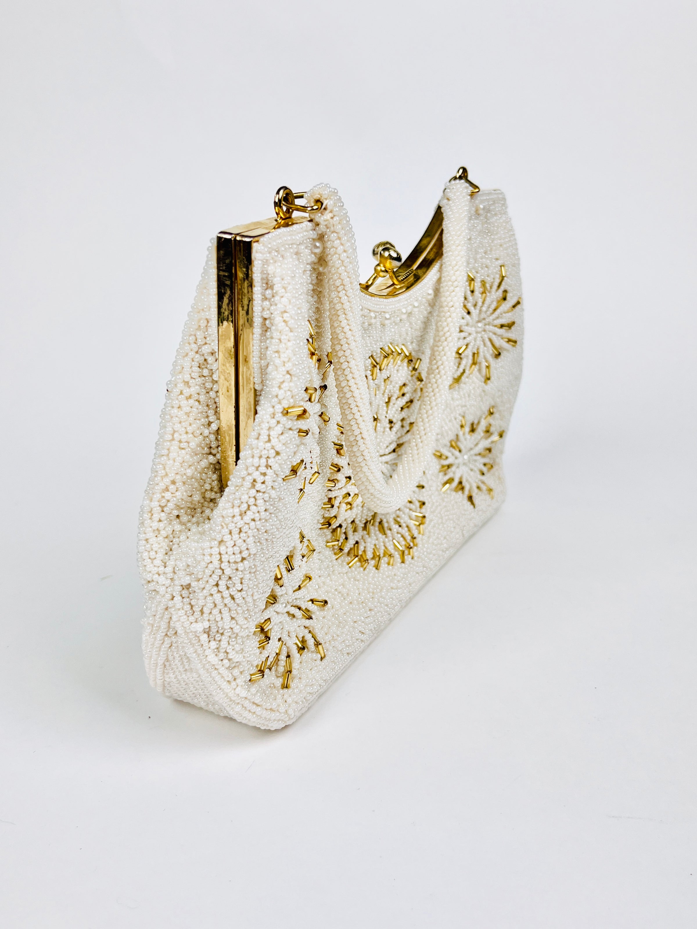 Vintage 1960s handbag featuring intricately hand-sewn white and gold glass beads throughout the exterior and handle. Gold tone hardware with kisslock closure. Satin-lined interior with small pocket.