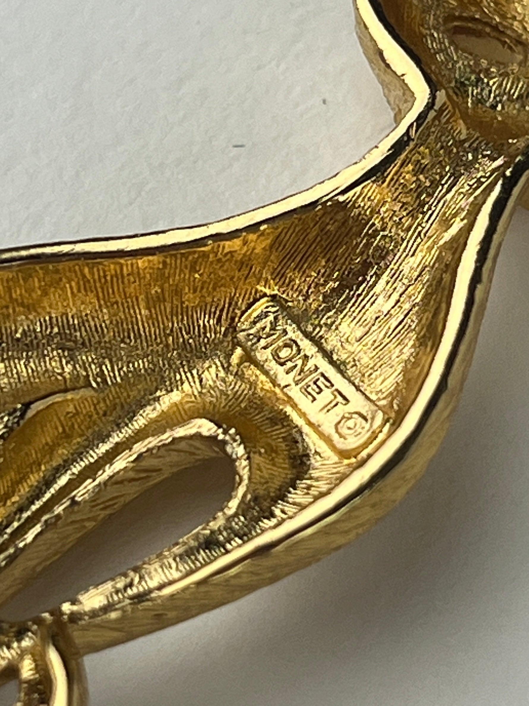 Vintage mid-century modern gold tone cat brooch by Monet. Signed.