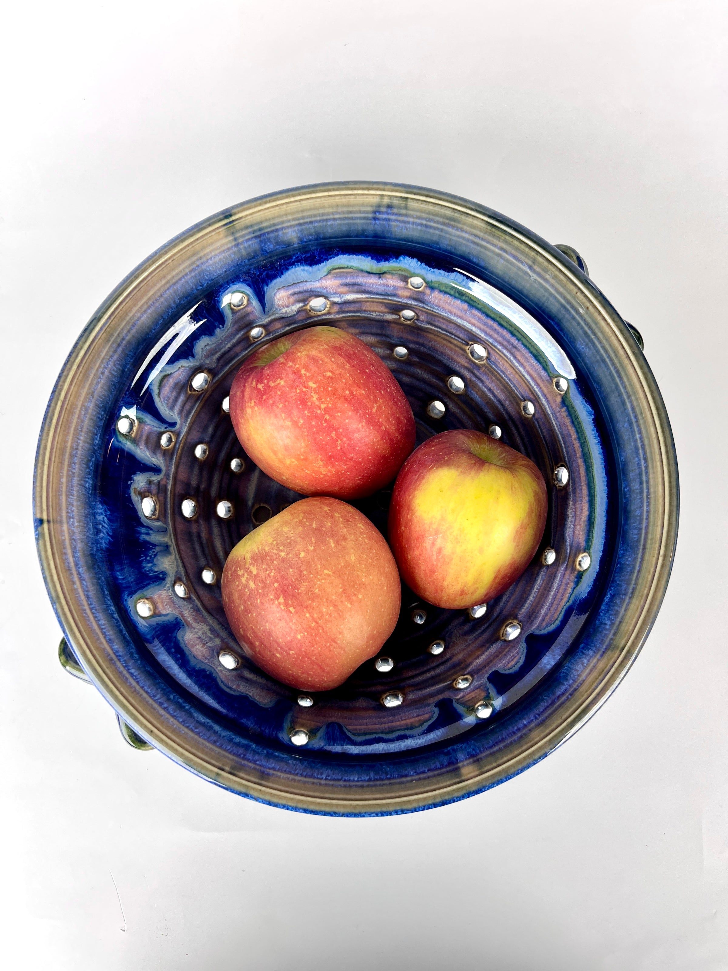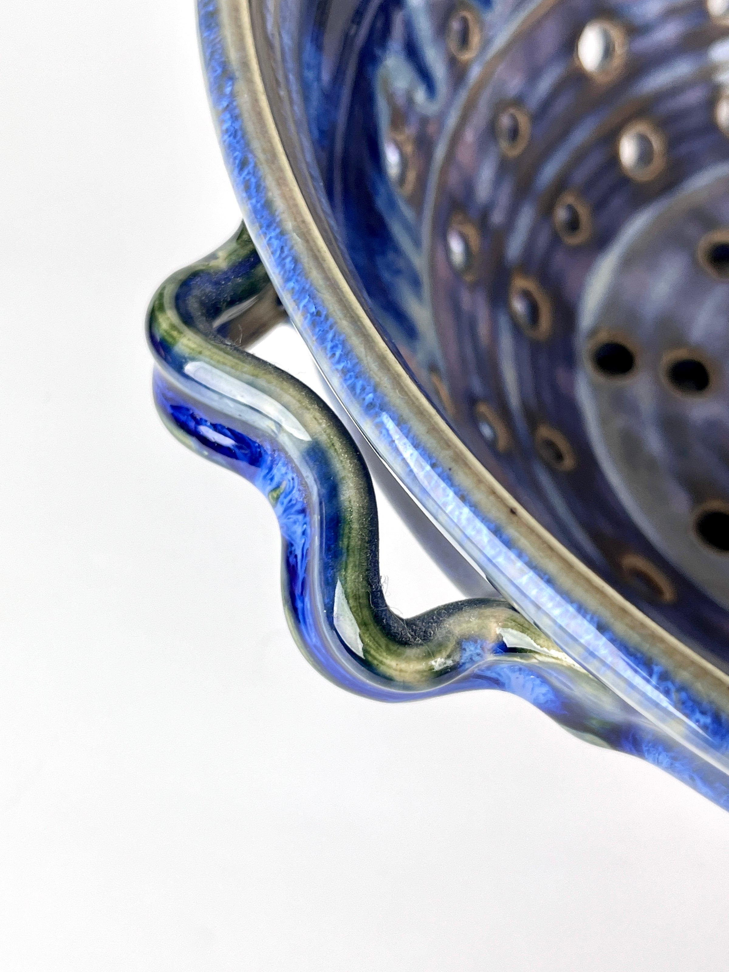 Gorgeous vintage handmade stoneware colander featuring luscious glazing in brilliant cobalt, lavender, pink, and green. Check out the lines on those handles! Perfect cleaning for fruits and vegetables, doubling as a luxurious serving bowl. Best of all—no plastic! Signed.