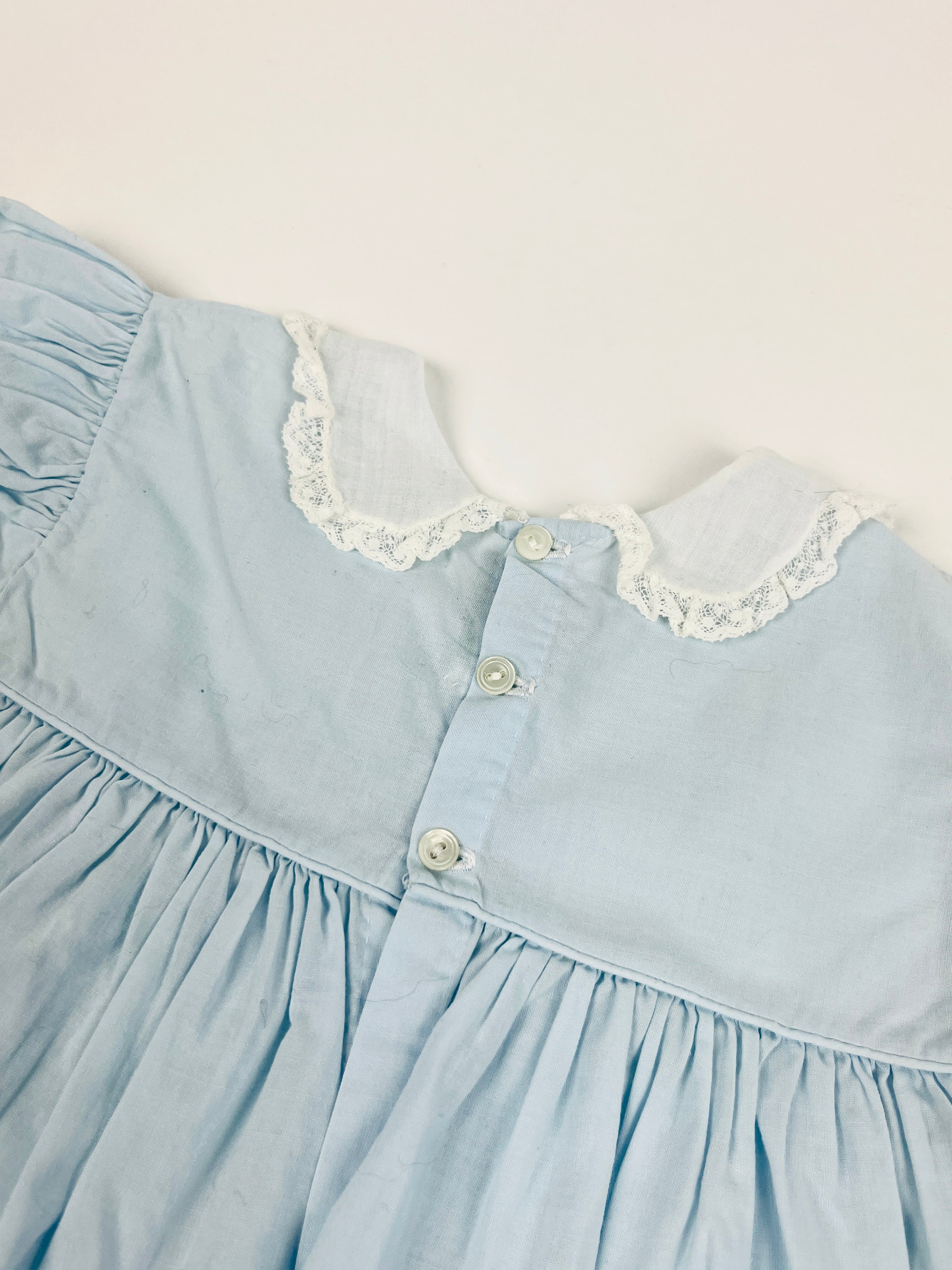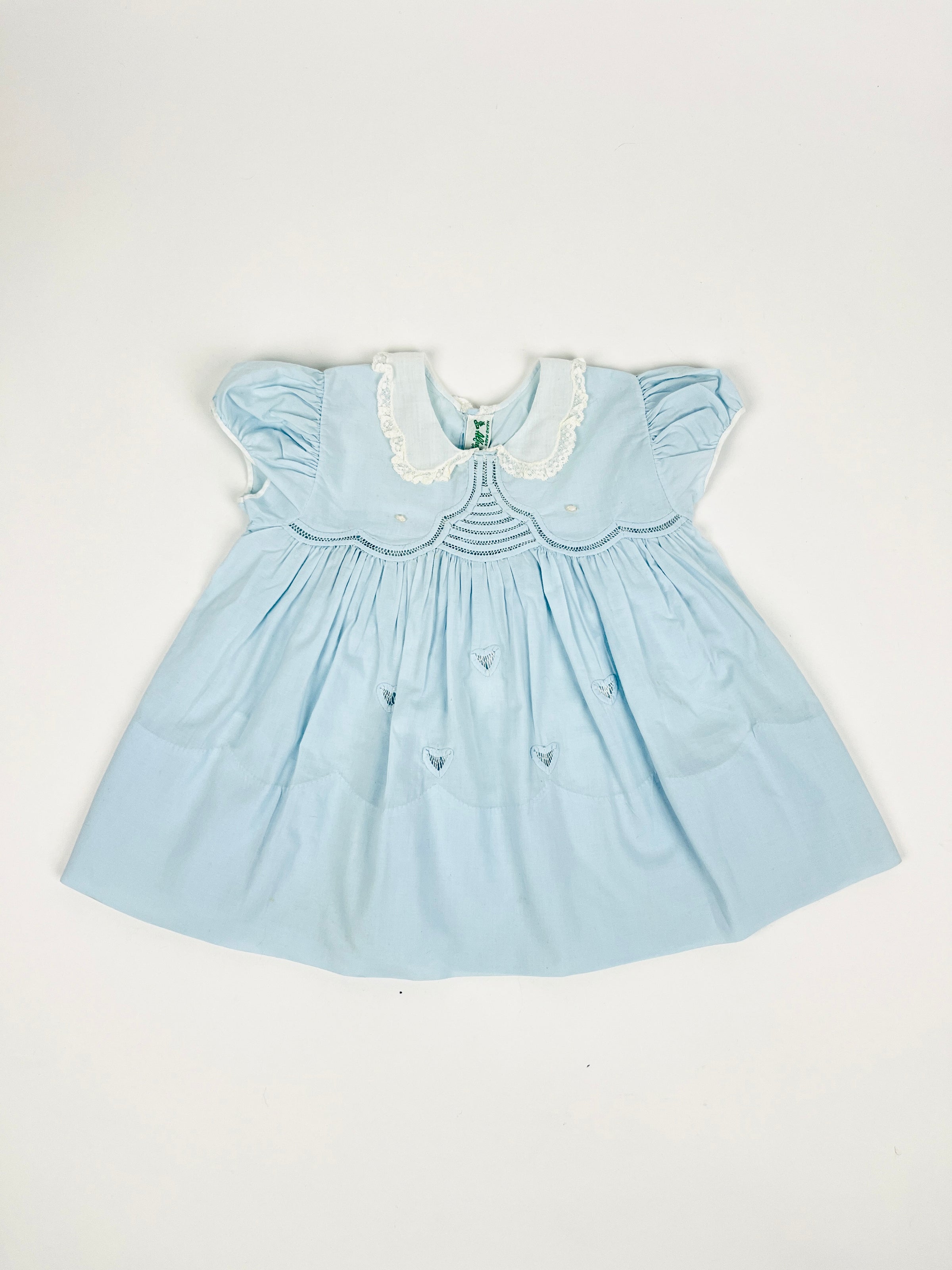 Precious 1960s vintage handmade baby dress featuring pastel blue fabric, gauzy white cotton collar with lace trim, intricate lace pattern, hearts, and two genuine freshwater pearls. Mother of pearl button closure on back. Handmade by Alfred Leon.
