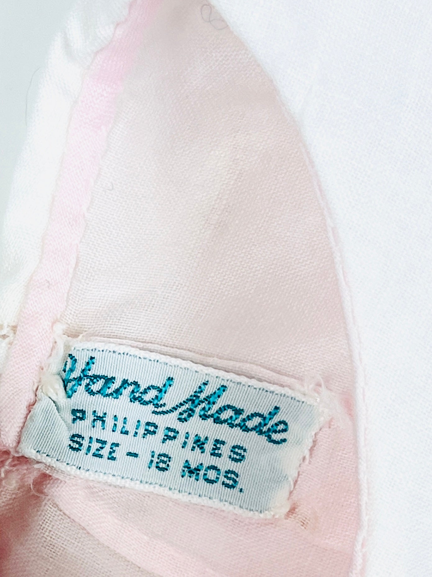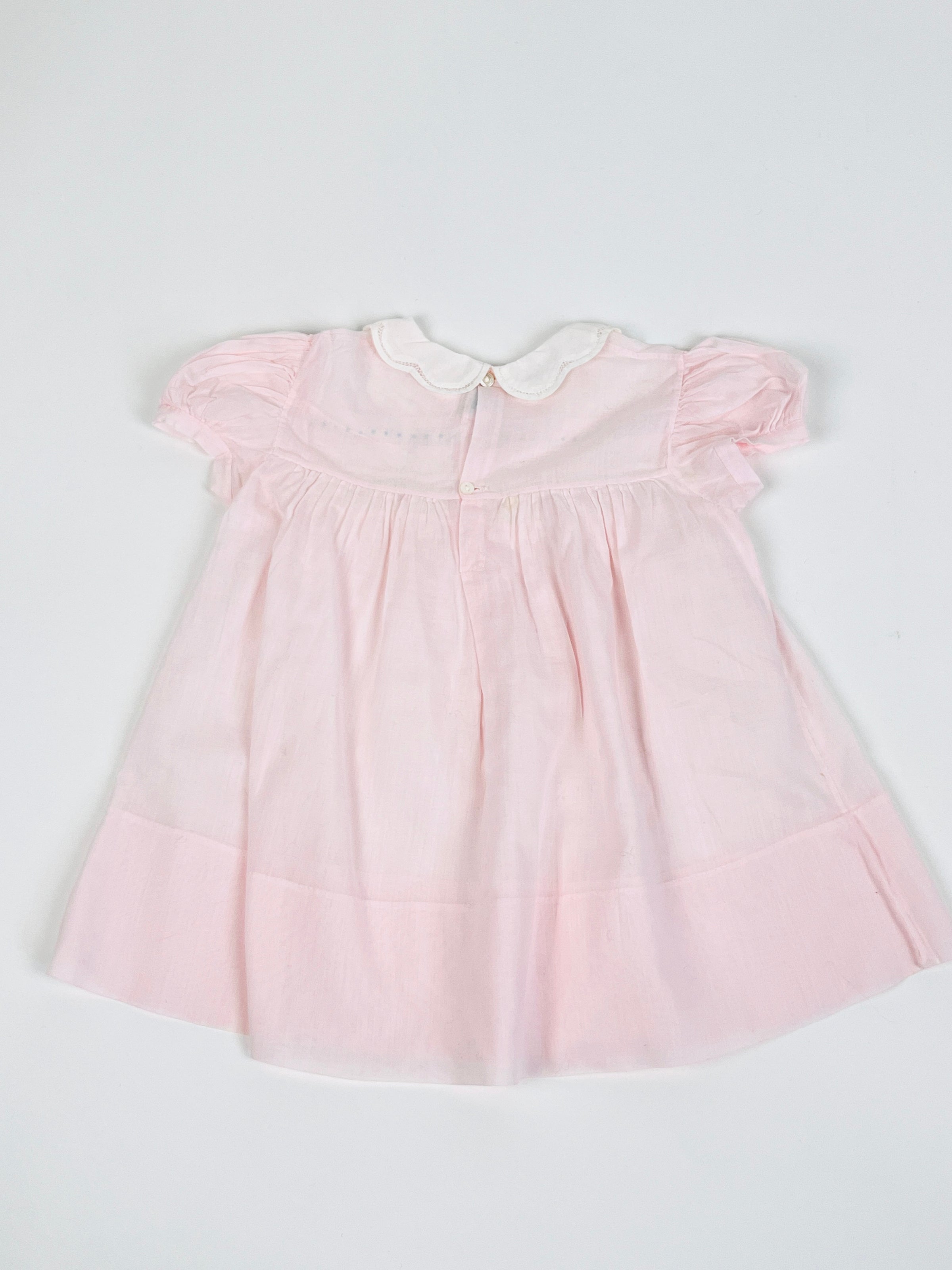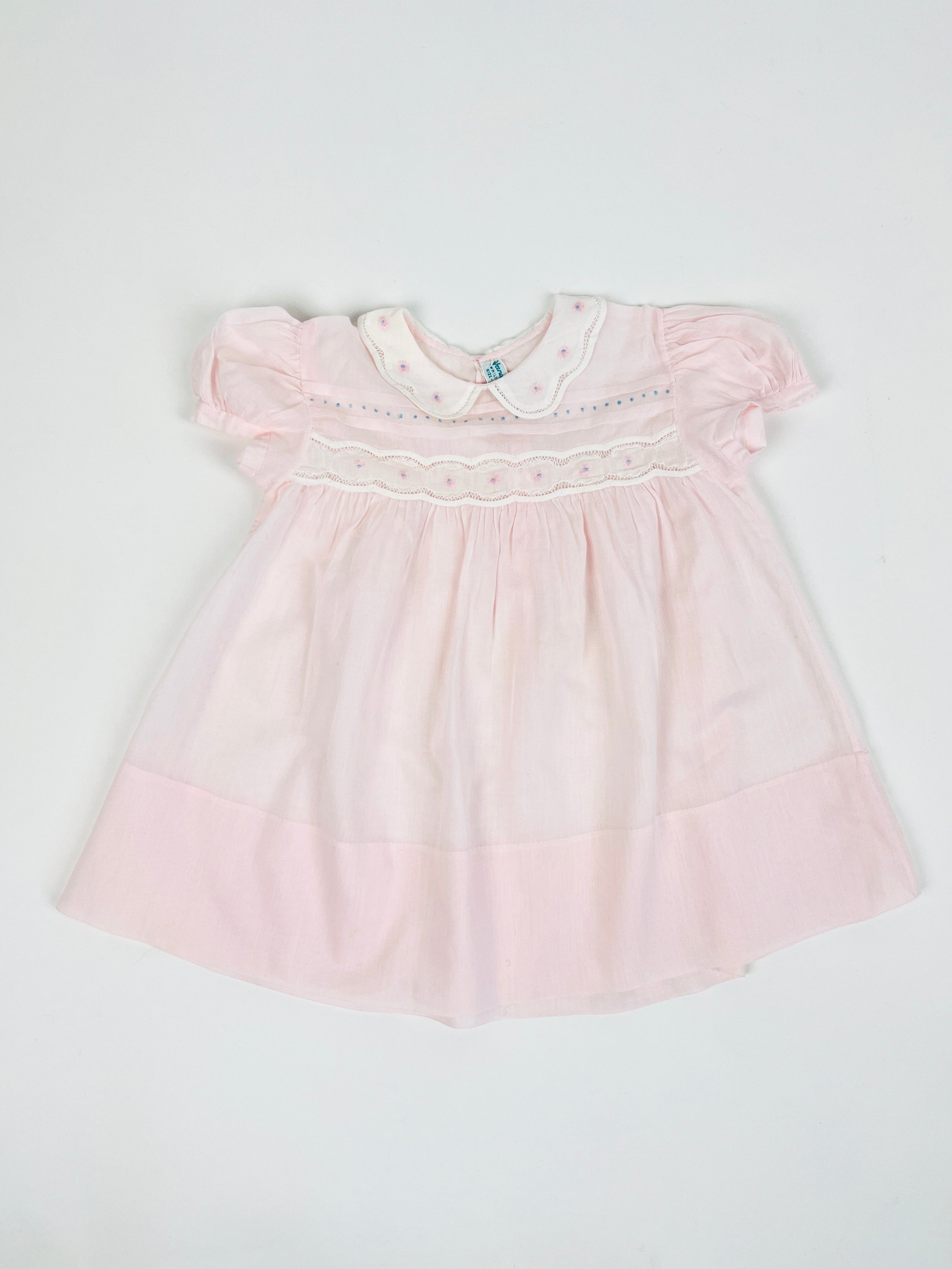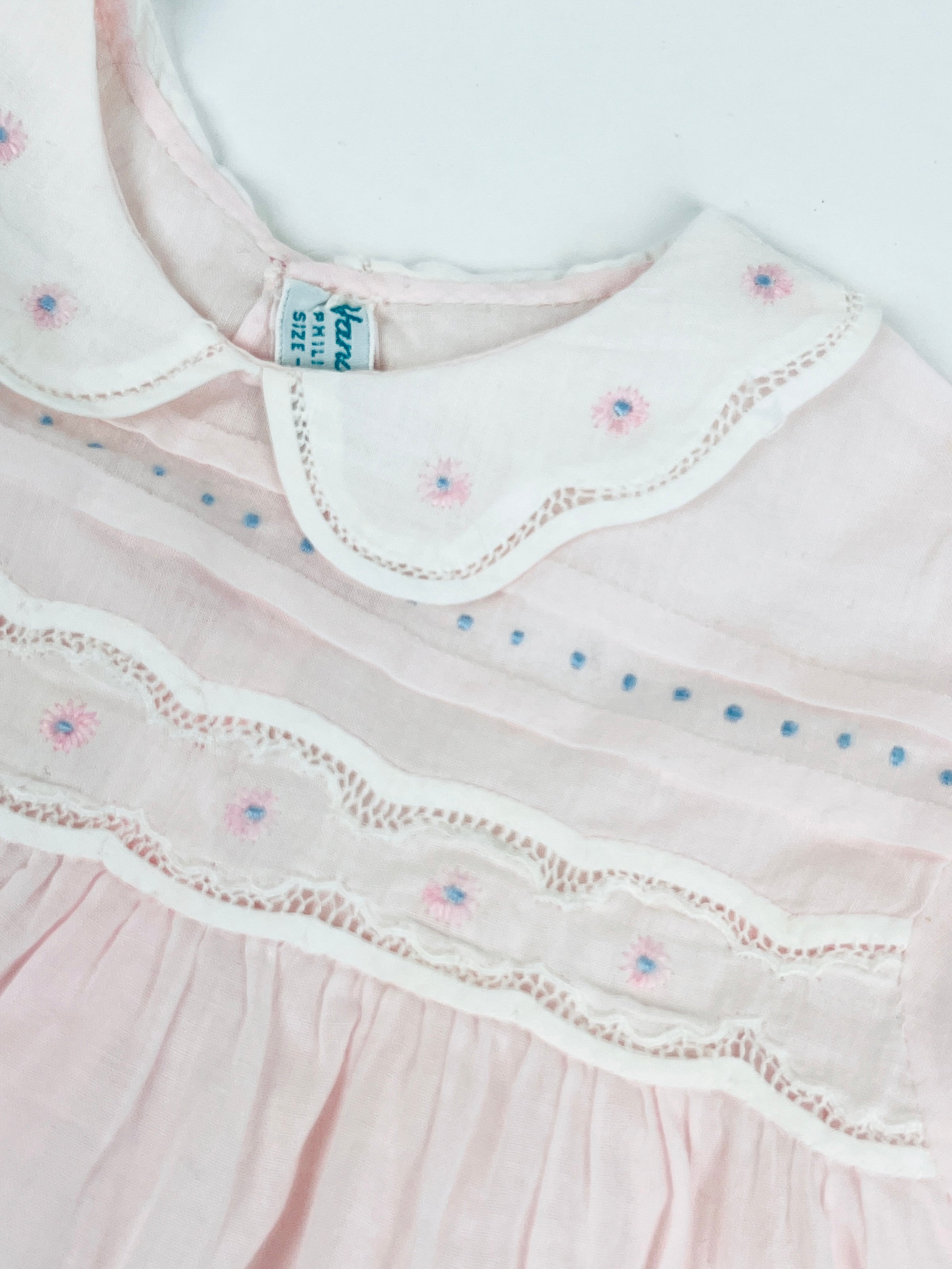 Precious 1960s vintage handmade baby dress featuring pastel pink fabric, white collar with embroidered floral detail and lace trim, and intricate lace and embroidered floral design. Mother of pearl button closure on back. Handmade by Alfred Leon.