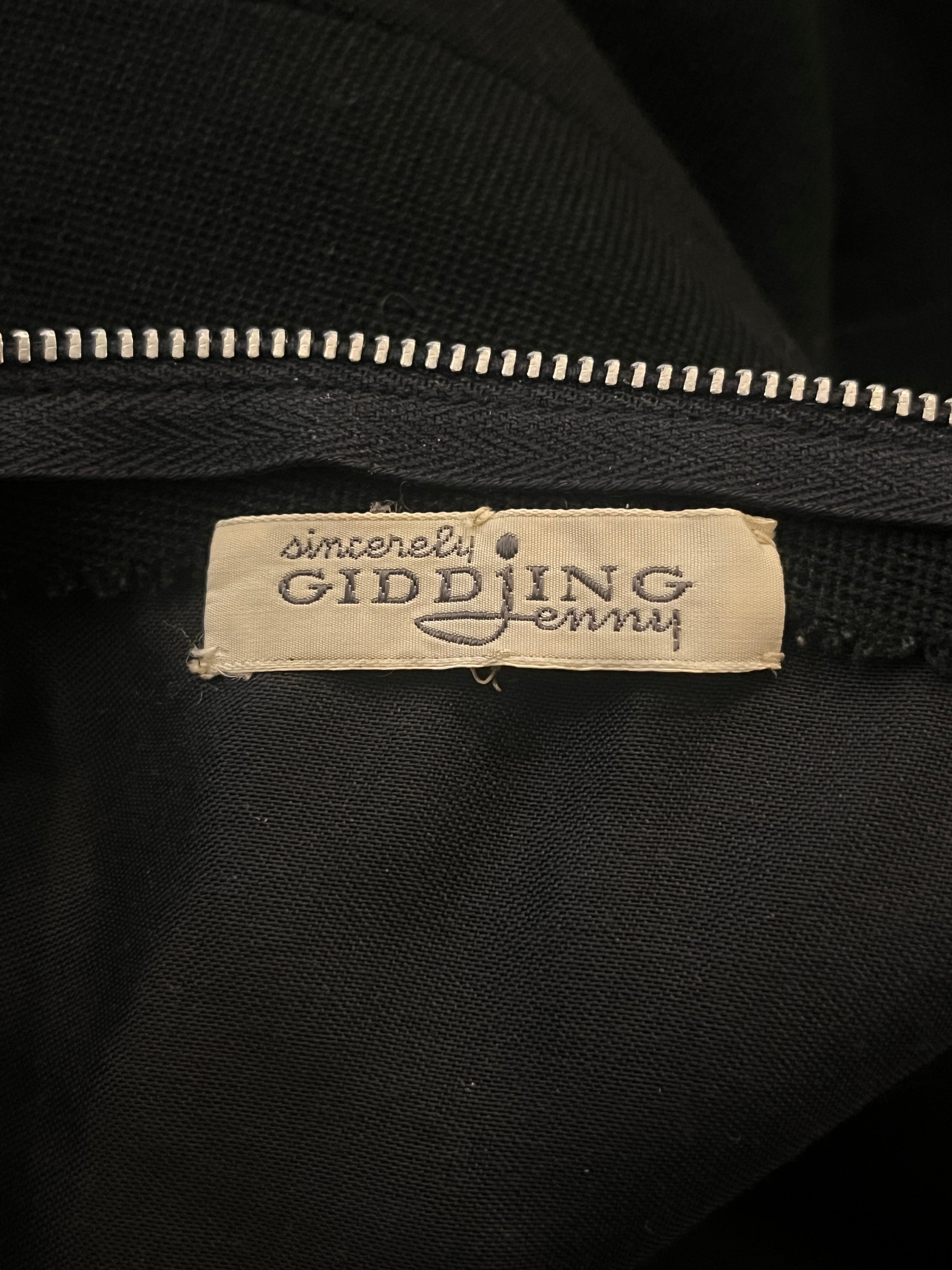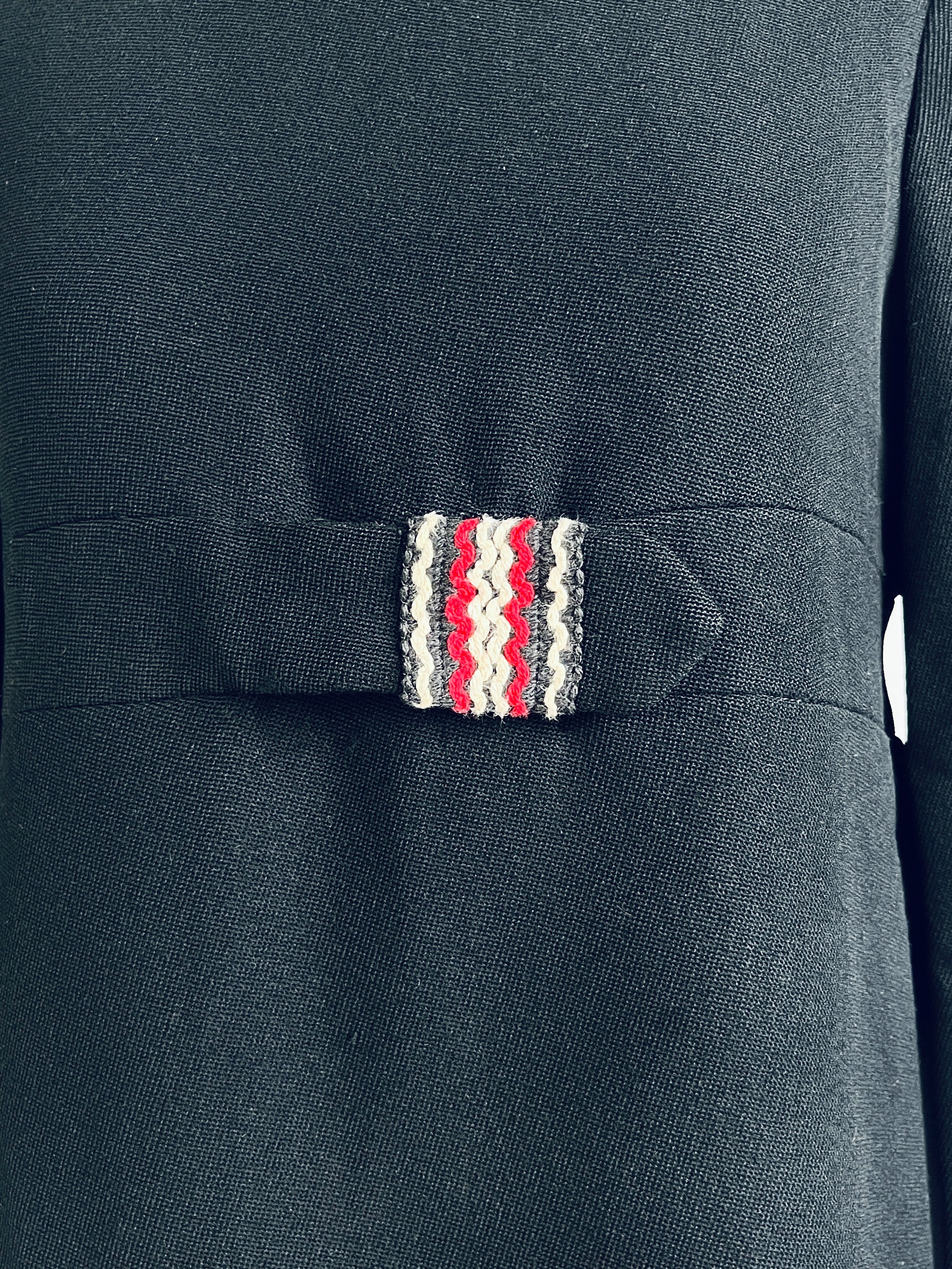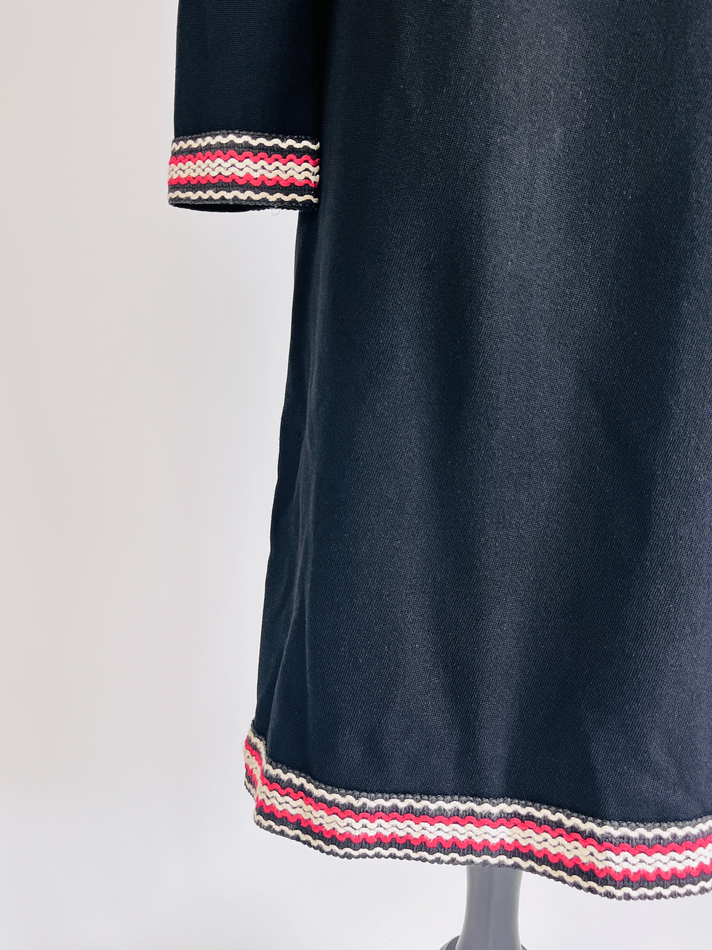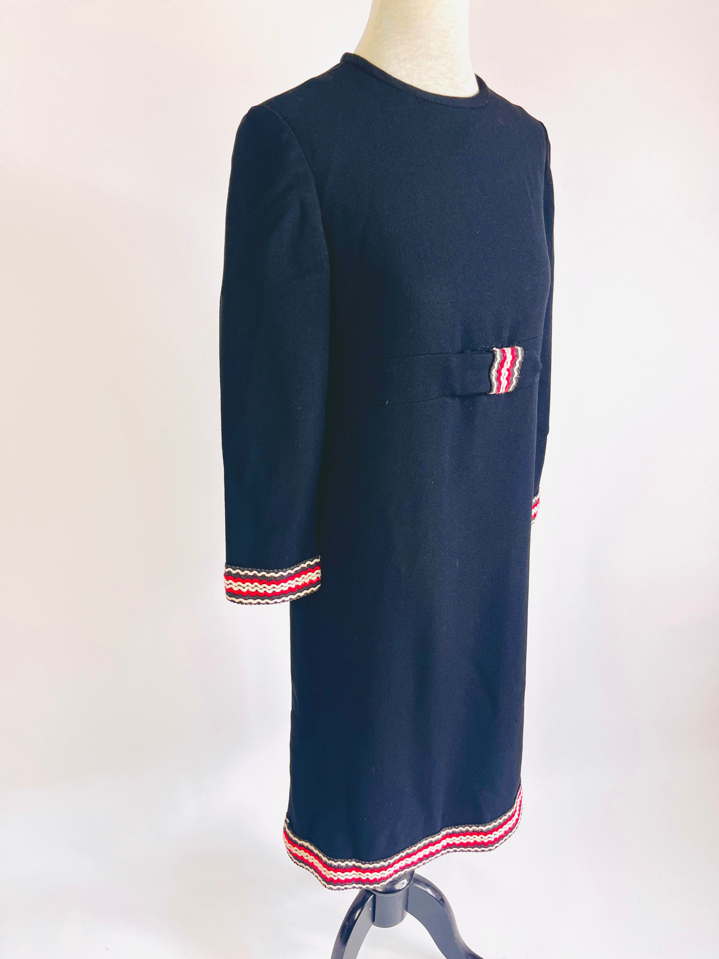 Vintage 1960s black 100% wool dress featuring woven wool exterior with red and white trim, soft cotton-lined interior, and metal zip closure in back. Made by Junior Sophisticated for high-end Cincinnati-based department store, Gidding-Jenny.