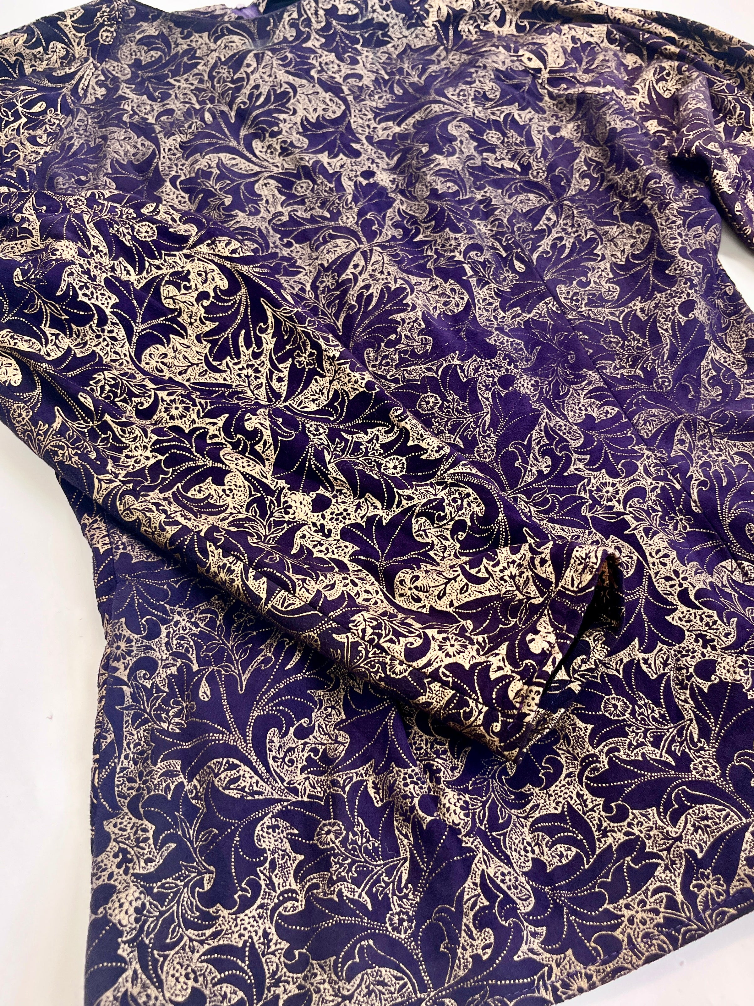 Vintage 1990s genuine suede shirt by Vakko, featuring a deep eggplant hue with an intricate metallic gold design, dolman sleeves, a fitted bodice, and zip closure in back. Dress it up with a skirt and heels or dress it down with jeans. Tuck it in or leave it out—there are so many ways to wear this statement piece.