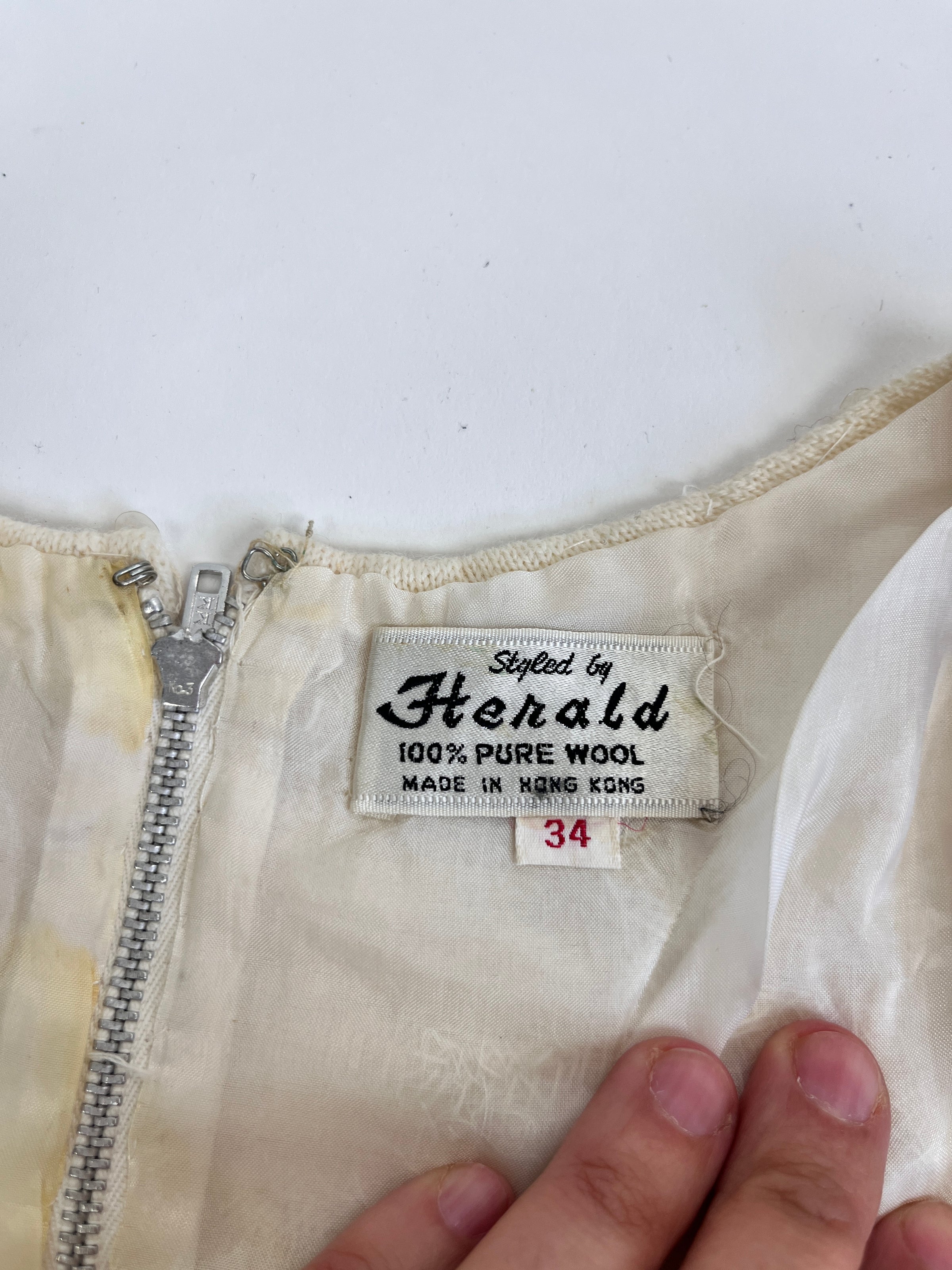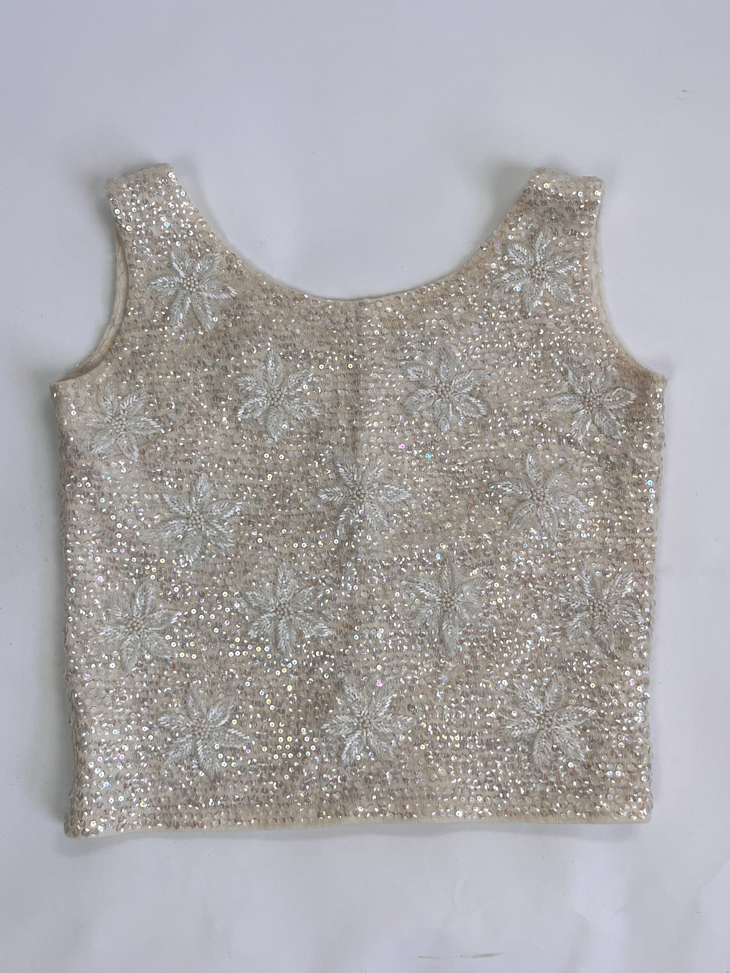 Vintage 1950s sleeveless sweater made from 100% wool and covered in a floral pattern made from white beads and opalescent sequins. Soft fabric-lined interior. Made by Styled by Herald. Metal zip closure in back.