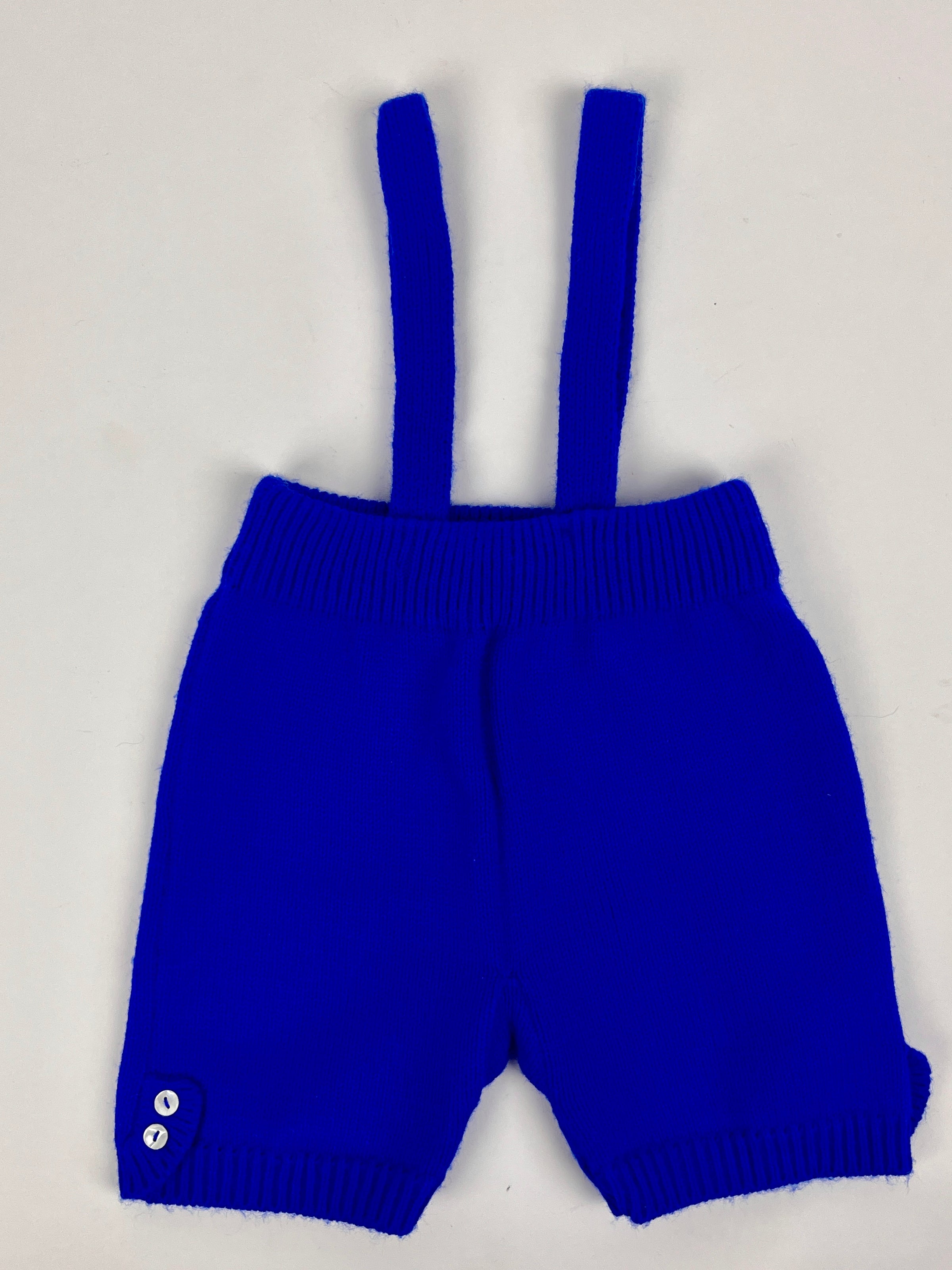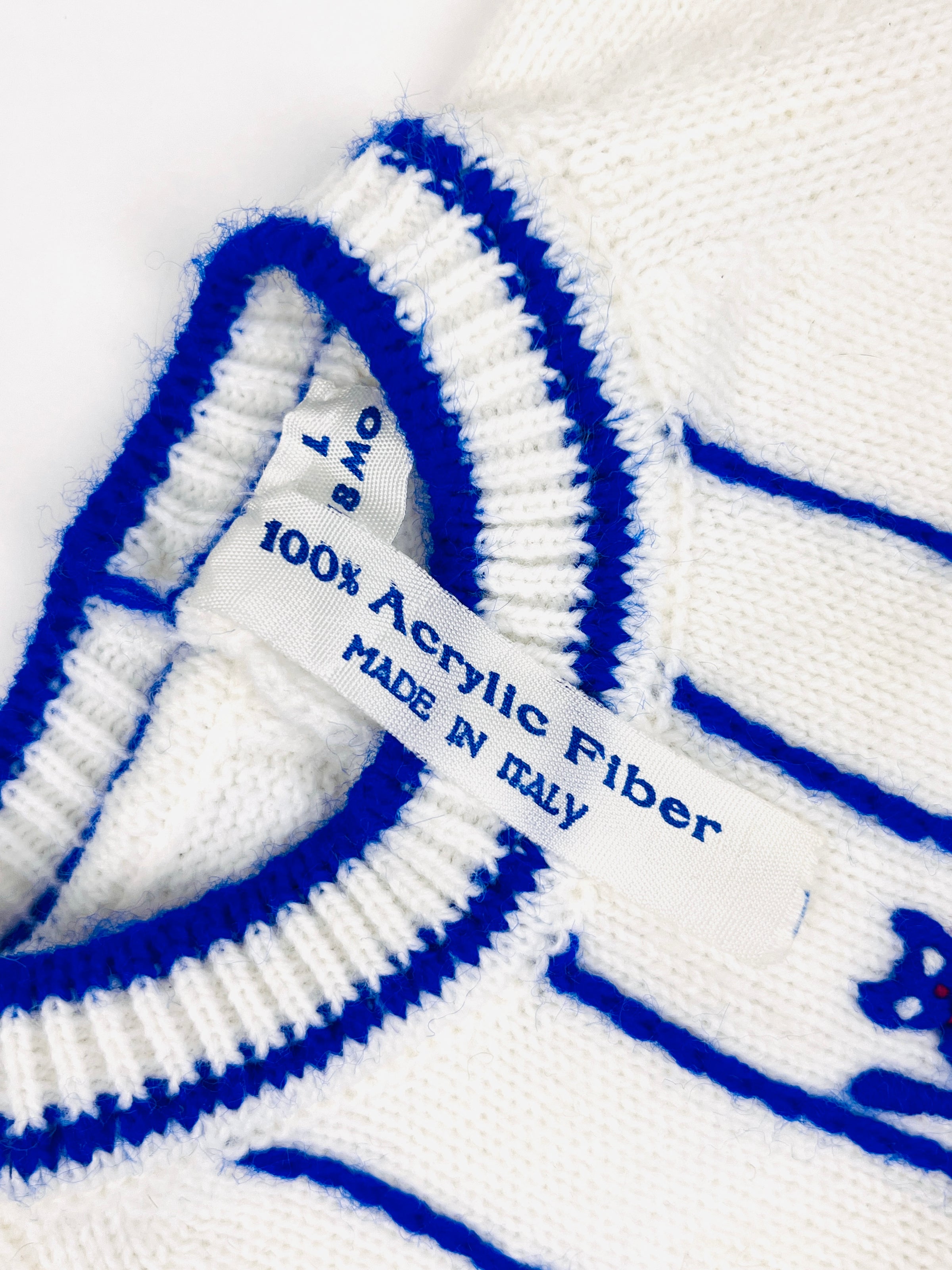 Adorable 1960s knit 2-piece baby set featuring white knit top with cobalt blue trim and kitties with bright red bows, and brilliant cobalt blue shorts with mother of pearl button details on each leg. Made in Italy.