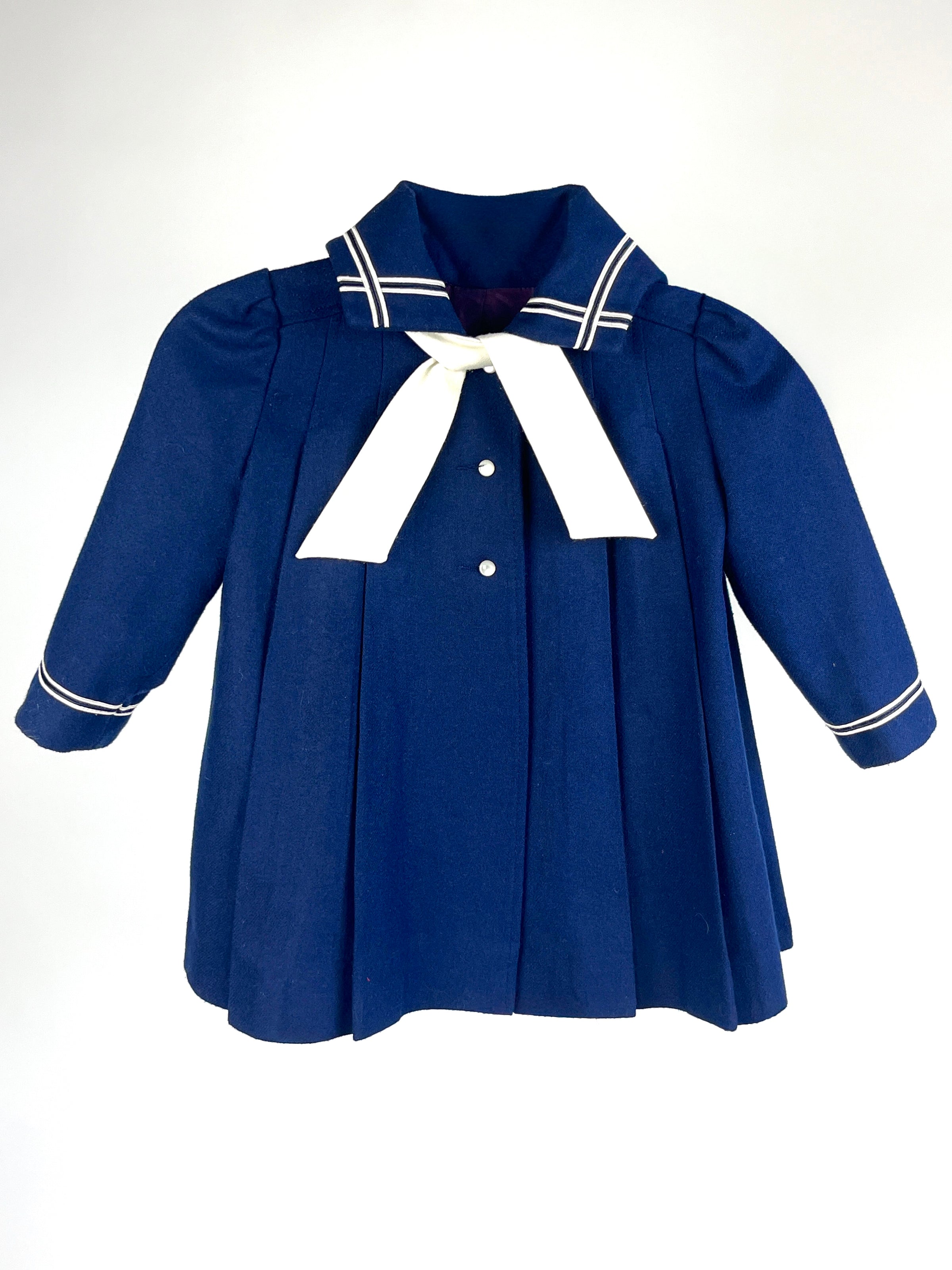 Charming vintage 1970s girls coat by Rothschild featuring navy blue wool blend shell, white trim, attached white linen scarf, and pearly shank buttons. Two pockets. Fabric lining. Made in the USA. Has the original Garment Union label!