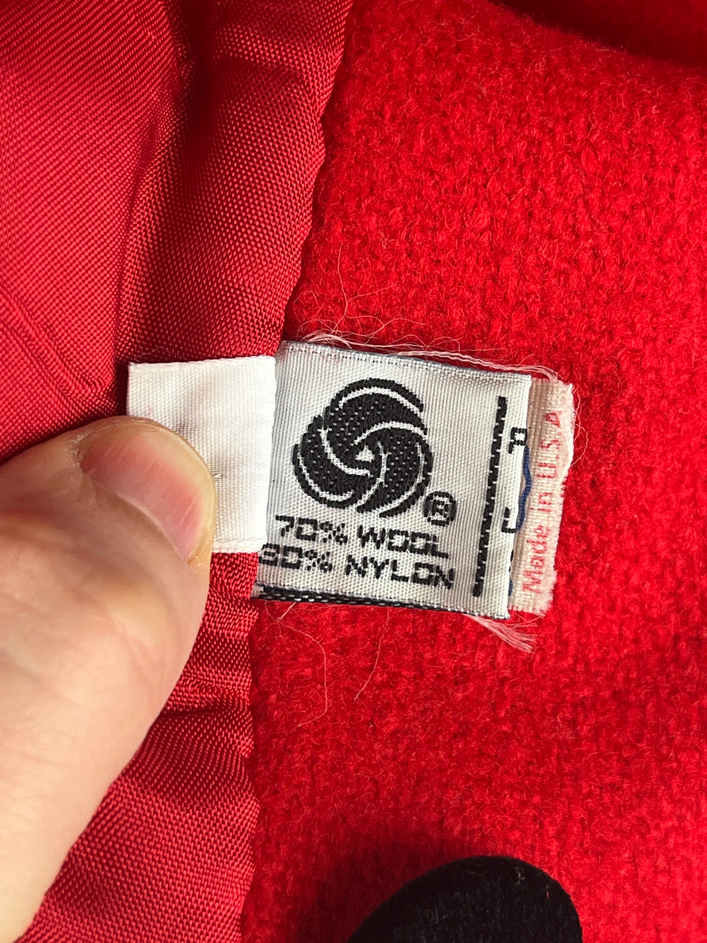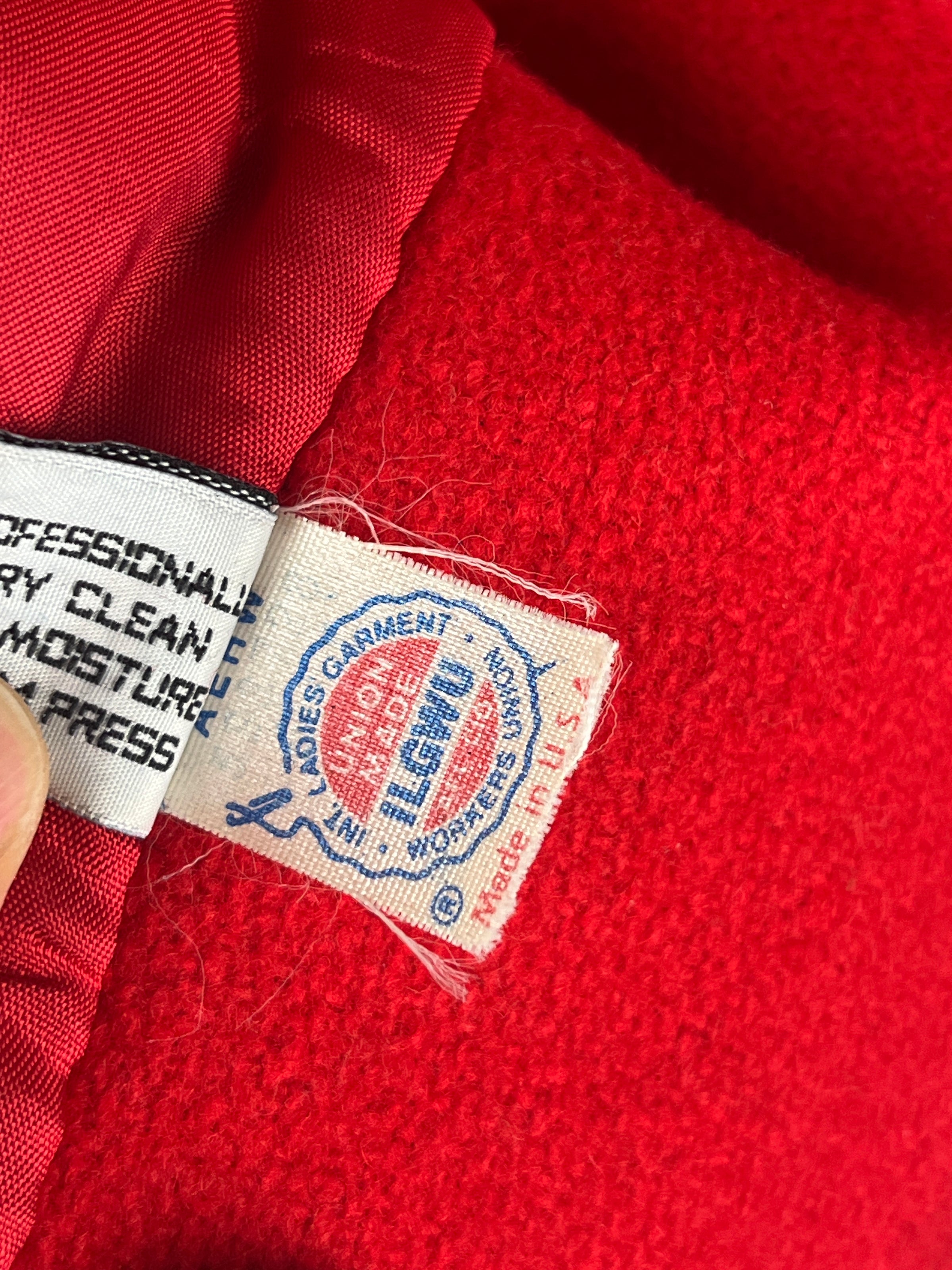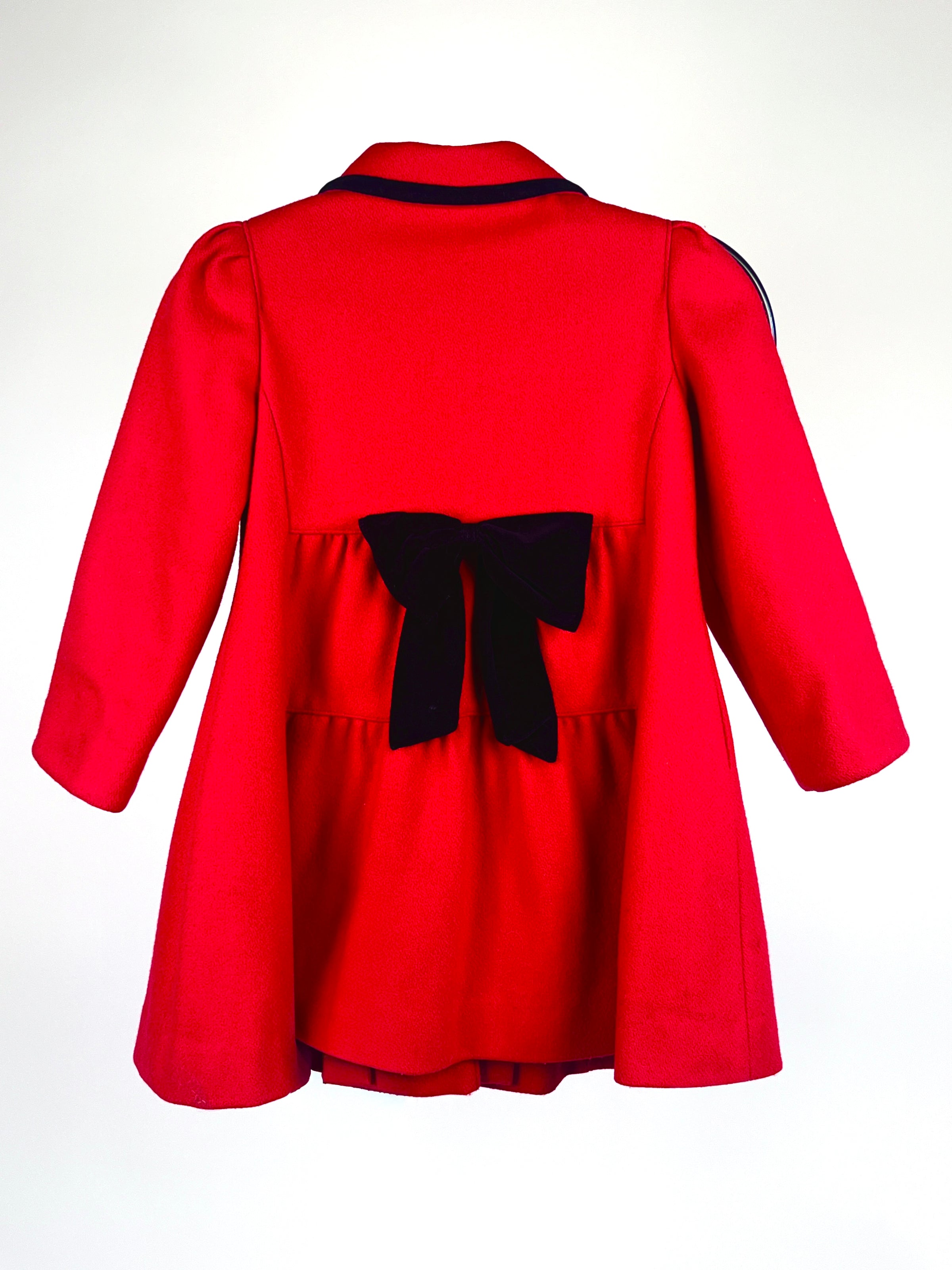 Charming vintage 1970s girls coat by Rothschild featuring vibrant red wool blend shell, black velvet trim, attached black velvet bow, and black velvet shank buttons. Cuff the sleeves to reveal black velvet cuffs. Two pockets. Fabric lining. Made in the USA. Has the original extra button and Garment Workers Union label!