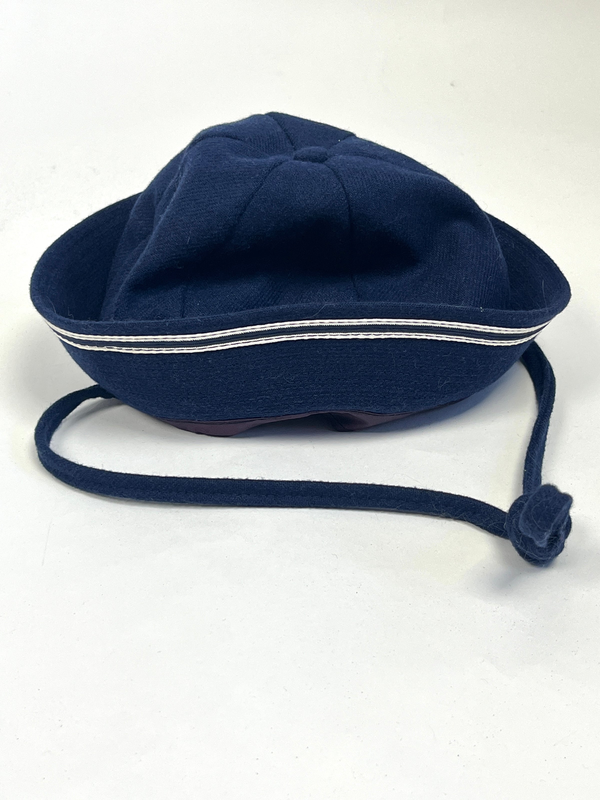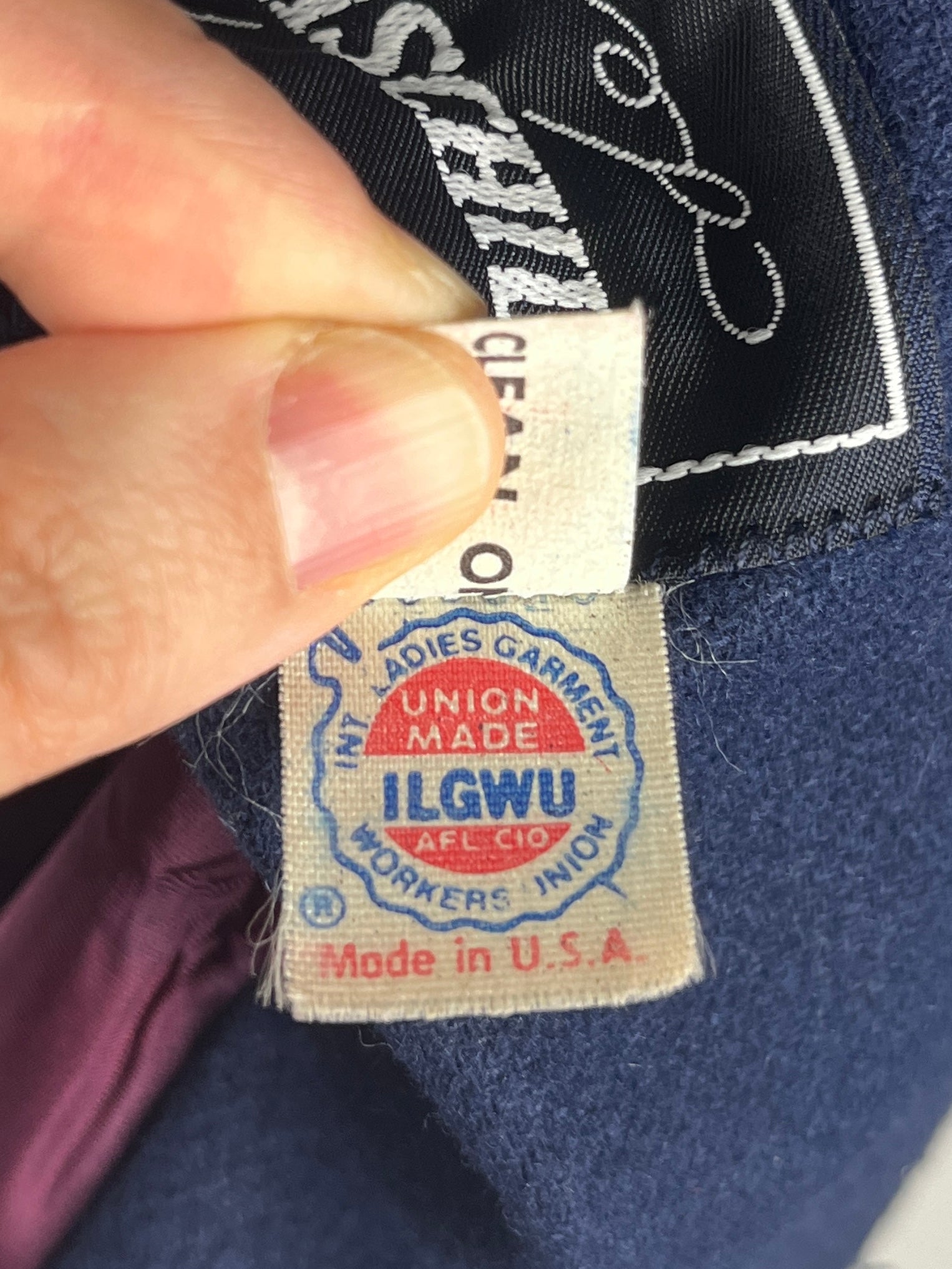 Charming vintage 1970s girls coat with matching hat by Rothschild featuring navy blue wool blend shell, white trim, attached white linen scarf, and pearly shank buttons. Two pockets. Fabric lining. Made in the USA. Has the original Garment Union label!