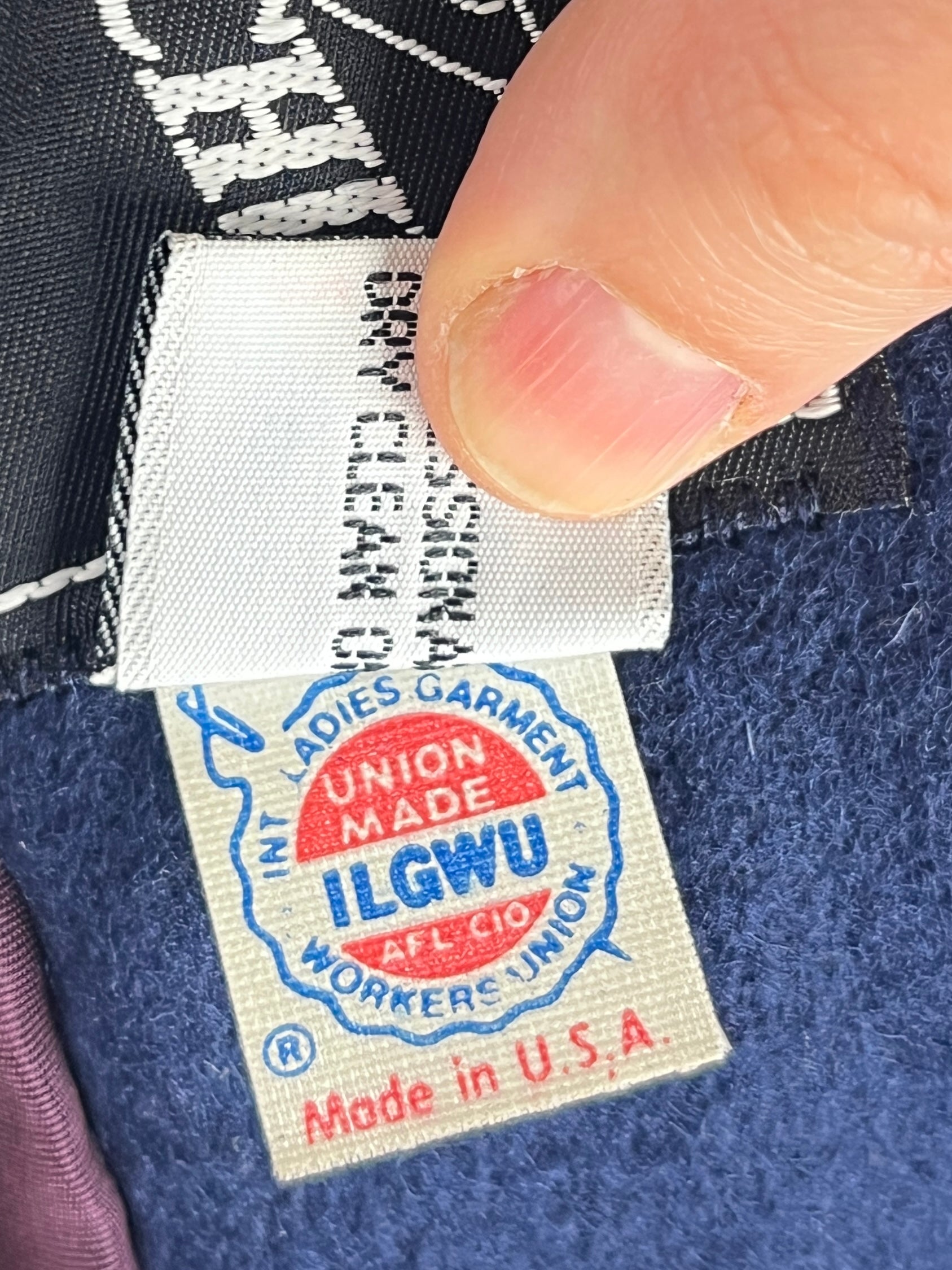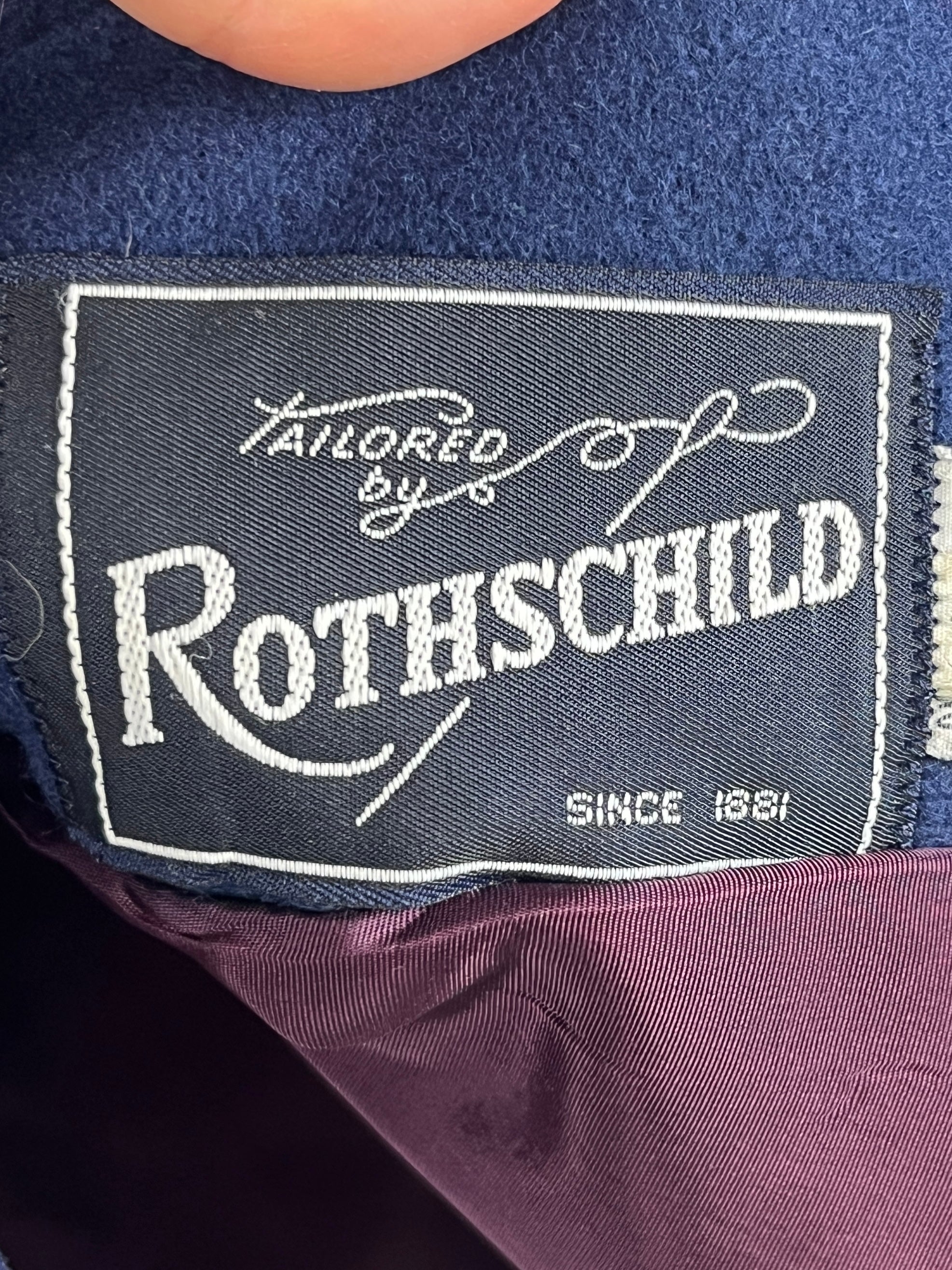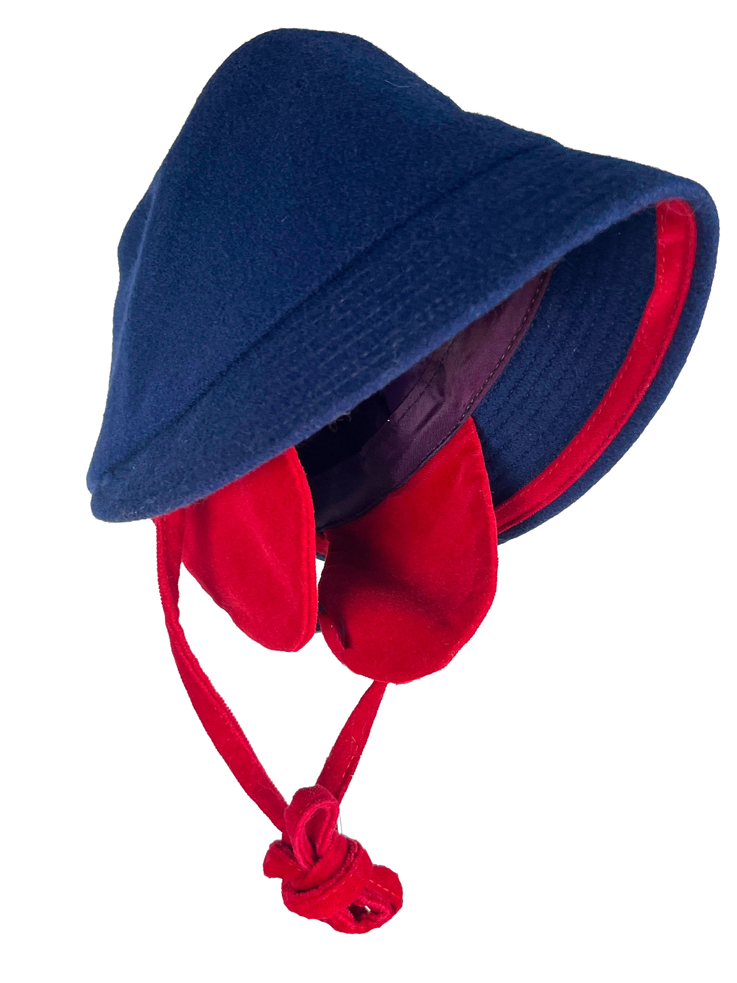 Charming vintage 1970s girls coat and matching hat by Rothschild featuring navy blue wool blend shell, red velvet trim, detachable red velvet scarf, and red velvet shank buttons. Two pockets. Fabric lining. Made in the USA. Has the original Garment Workers Union label!