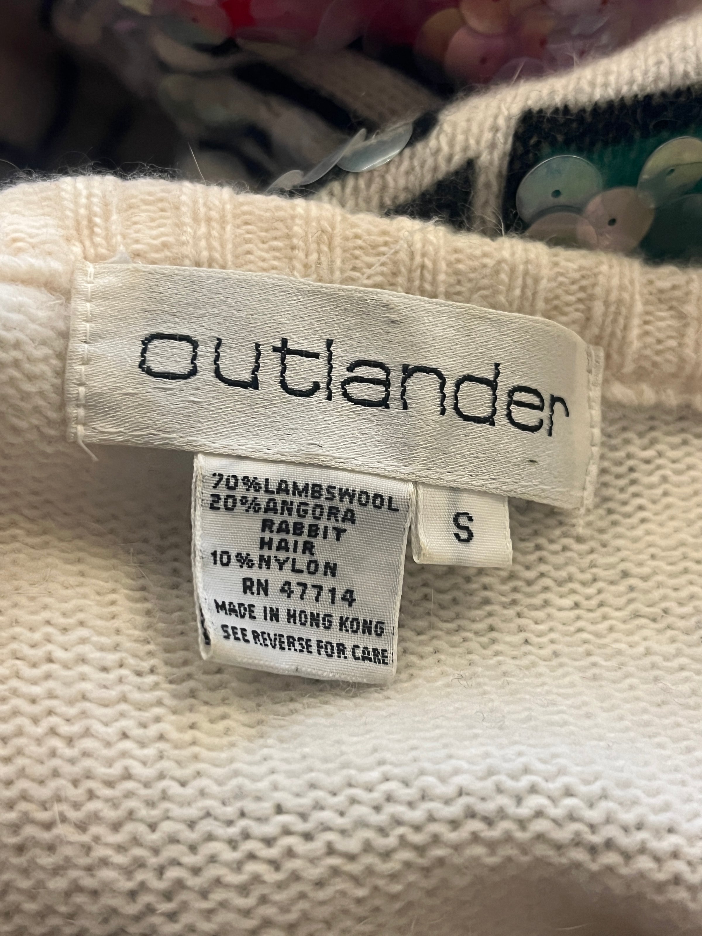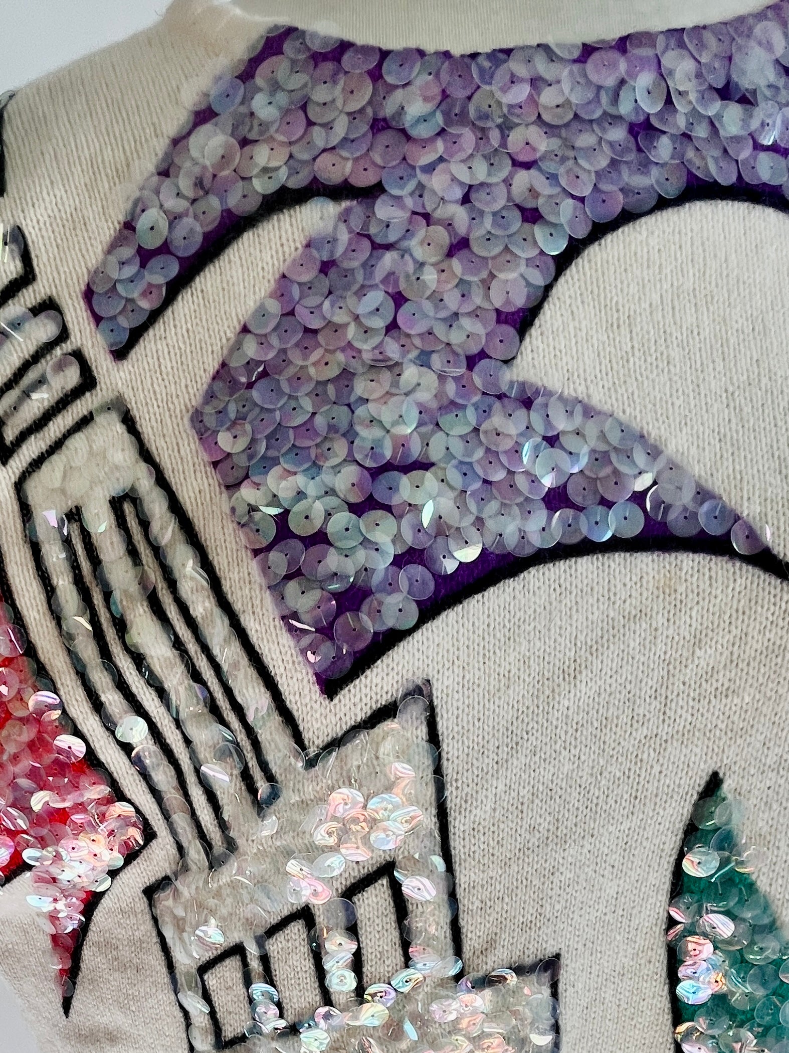 Vintage 90s sweater dress featuring a cream knit fabric throughout with abstract, multicolor shapes covered in opalescent sewn-on sequins. Made by Outlander, with a blend of angora, wool, and nylon fibers.