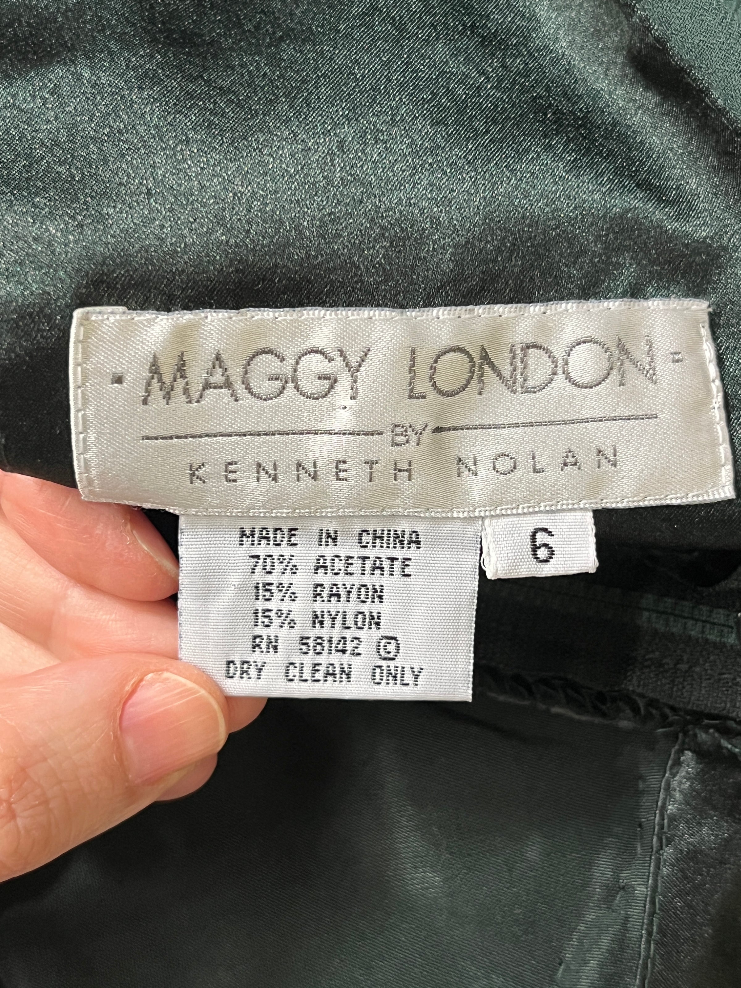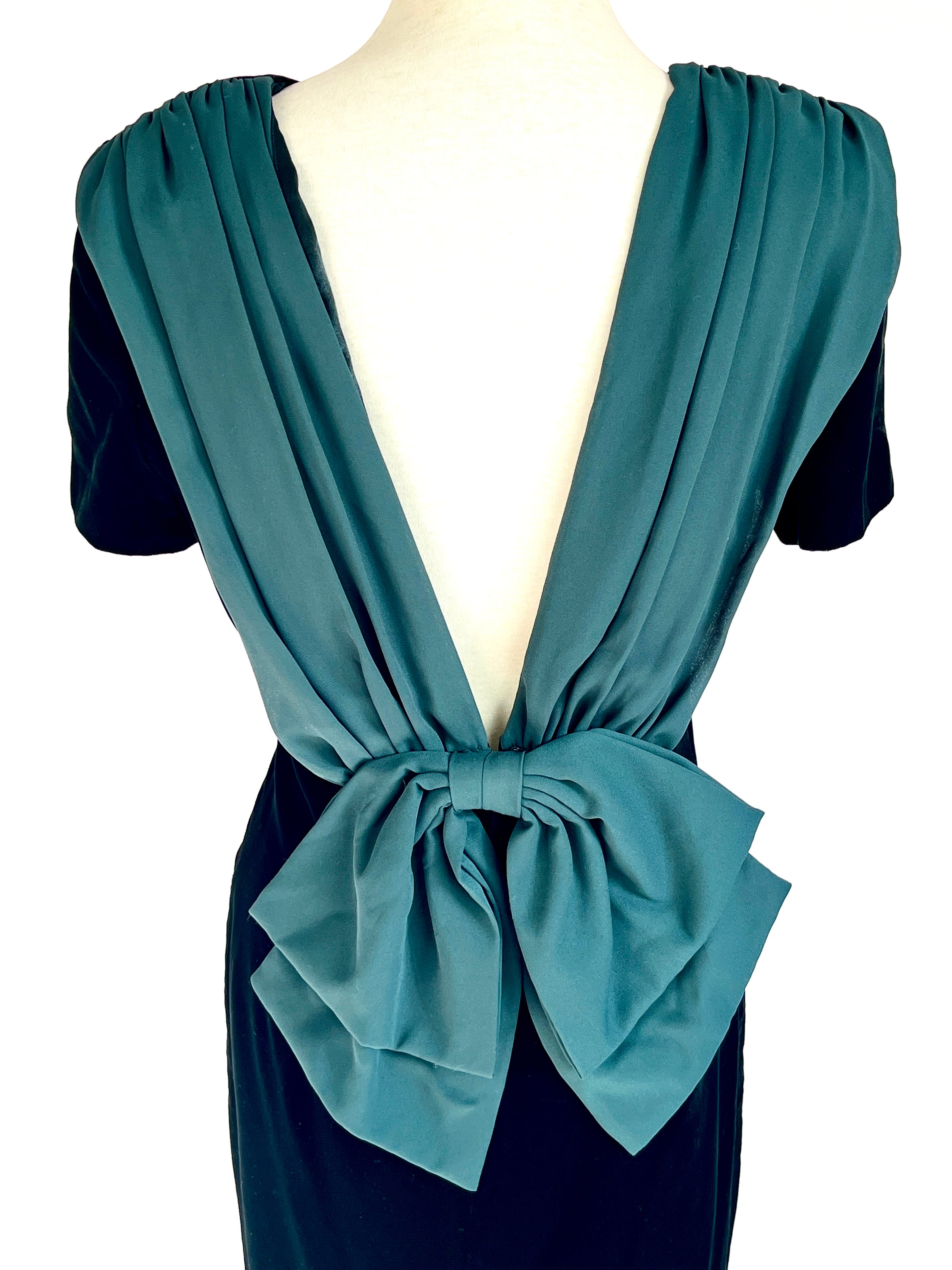 The back of this Maggy London dress absolutely steals the show, with organza pleats dramatically plunging into a bow at the tailbone. Mixed hues of deep forest green add extra visual interest to what would otherwise be a simple velvet gown. While the front of this gown provides an illusion of modesty, the deep “V” back and 17” slit in back quickly prove that the wearer isn’t afraid to show a little skin in a classy way. Zip closure in back. Bra strap holders on shoulder interior.