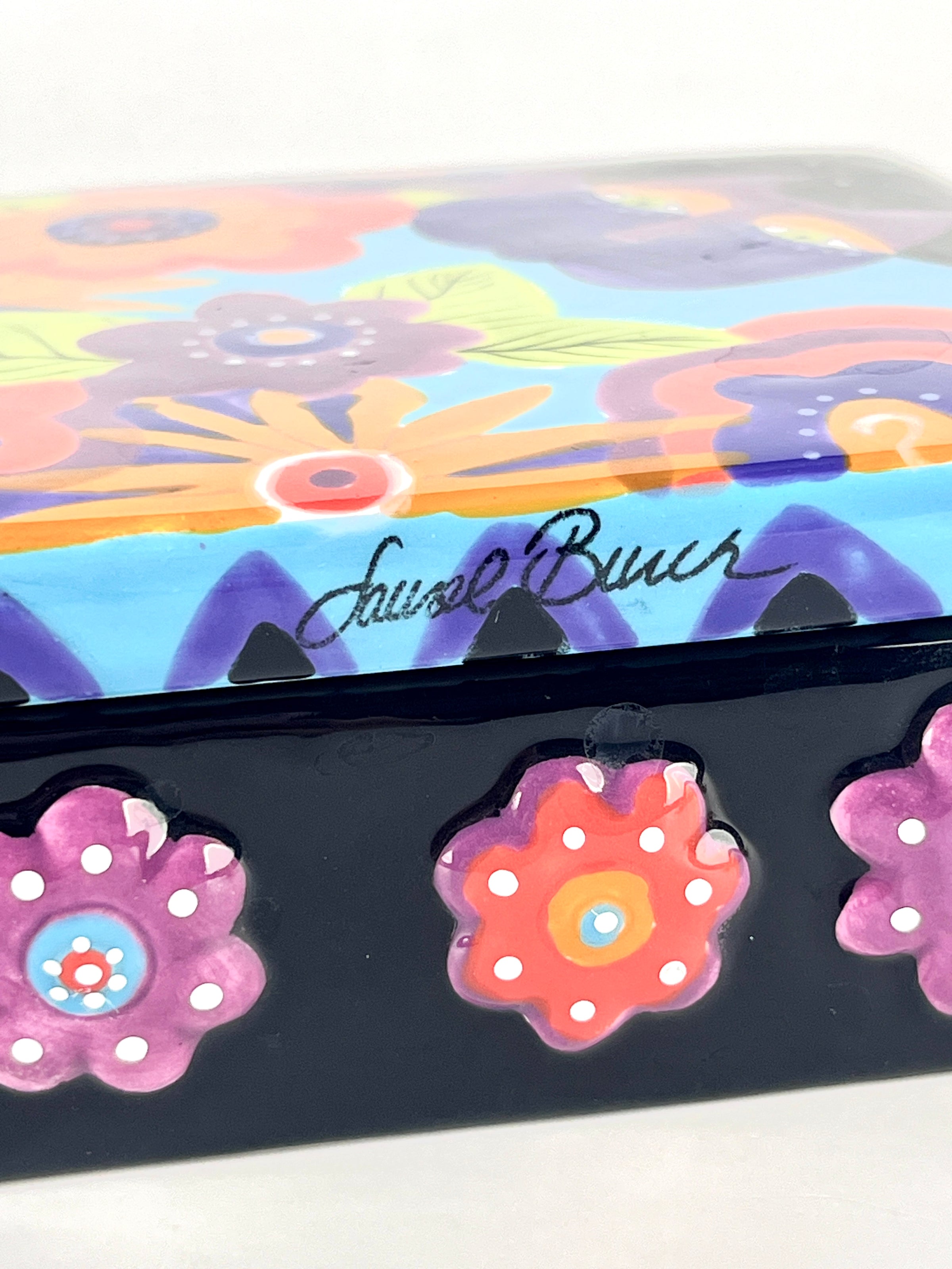 Vintage 90s ceramic lidded box by Laurel Burch featuring a floral and cat design. Perfect for holding small, precious items for both adults and children. Signed.