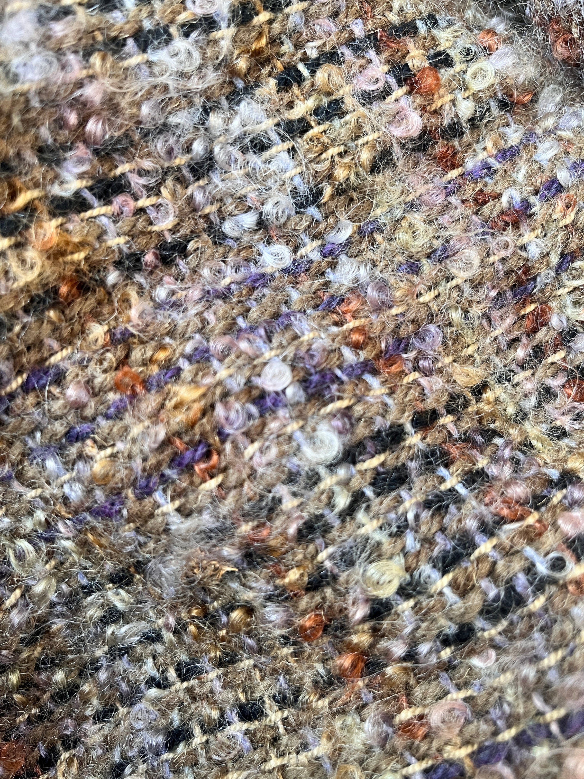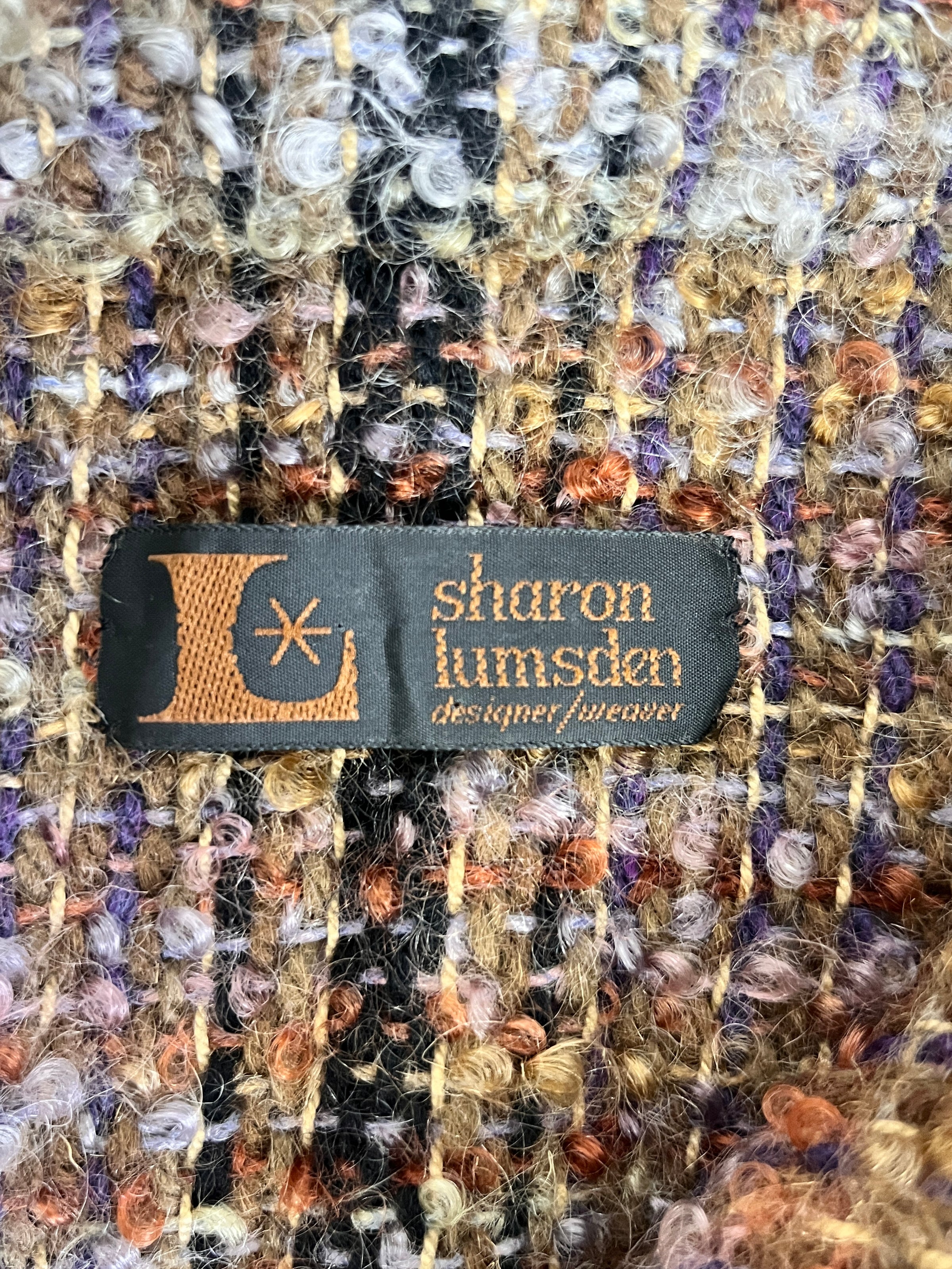 Vintage 1980s handwoven 100% goat wool Mohair sweater by Sharon Lumsden, featuring a beautiful multicolor design in earthy tones of olive green, purple, lilac, light blue, copper, copper, hay, and black. Hook and eye closure at the neck, with an open front below. Makes a great layering piece in fall, winter, and spring.