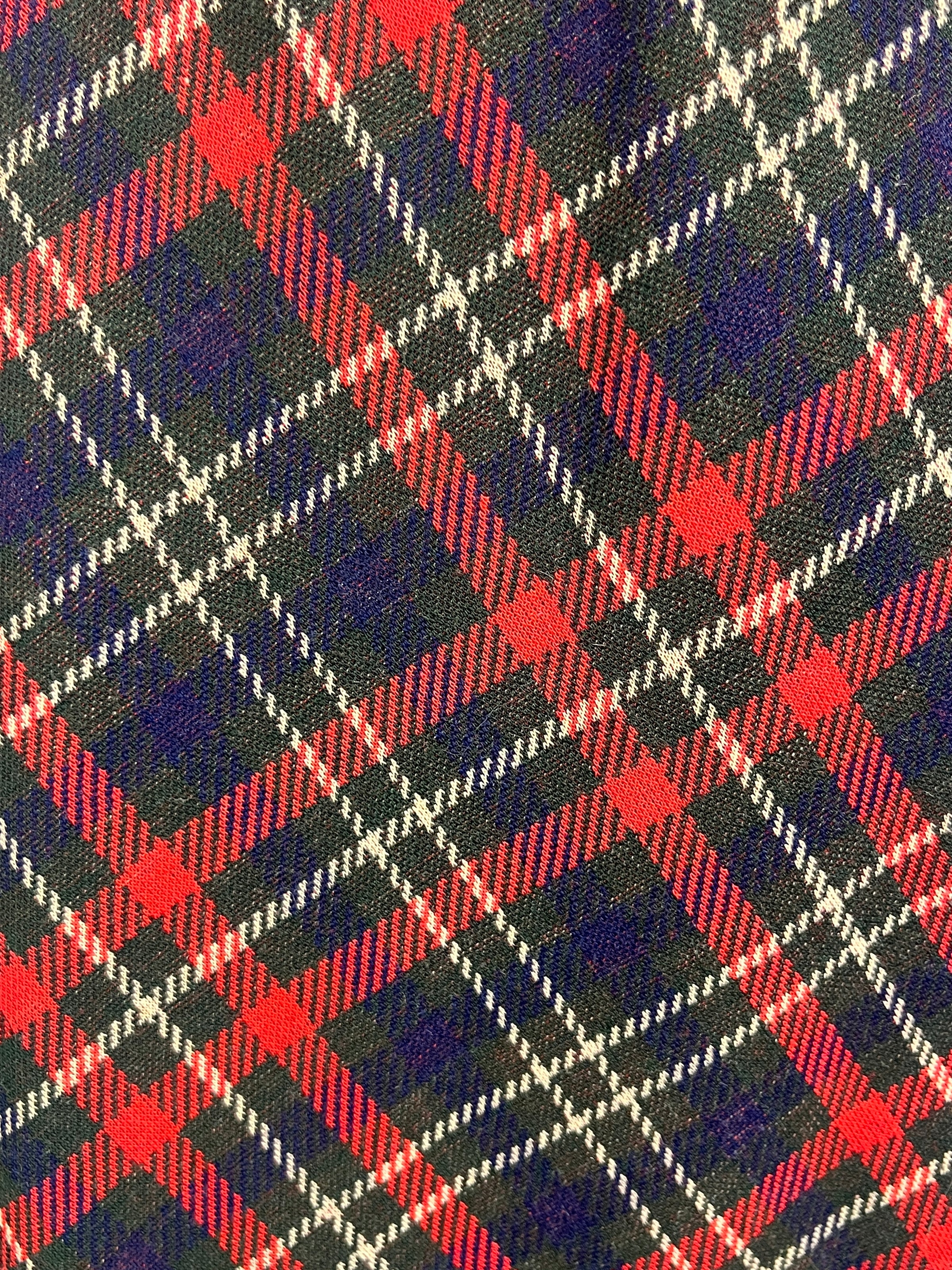 Vintage maxi skirt in red, Forest green, white, and navy blue plaid. Contains International Garment Workers Union label.