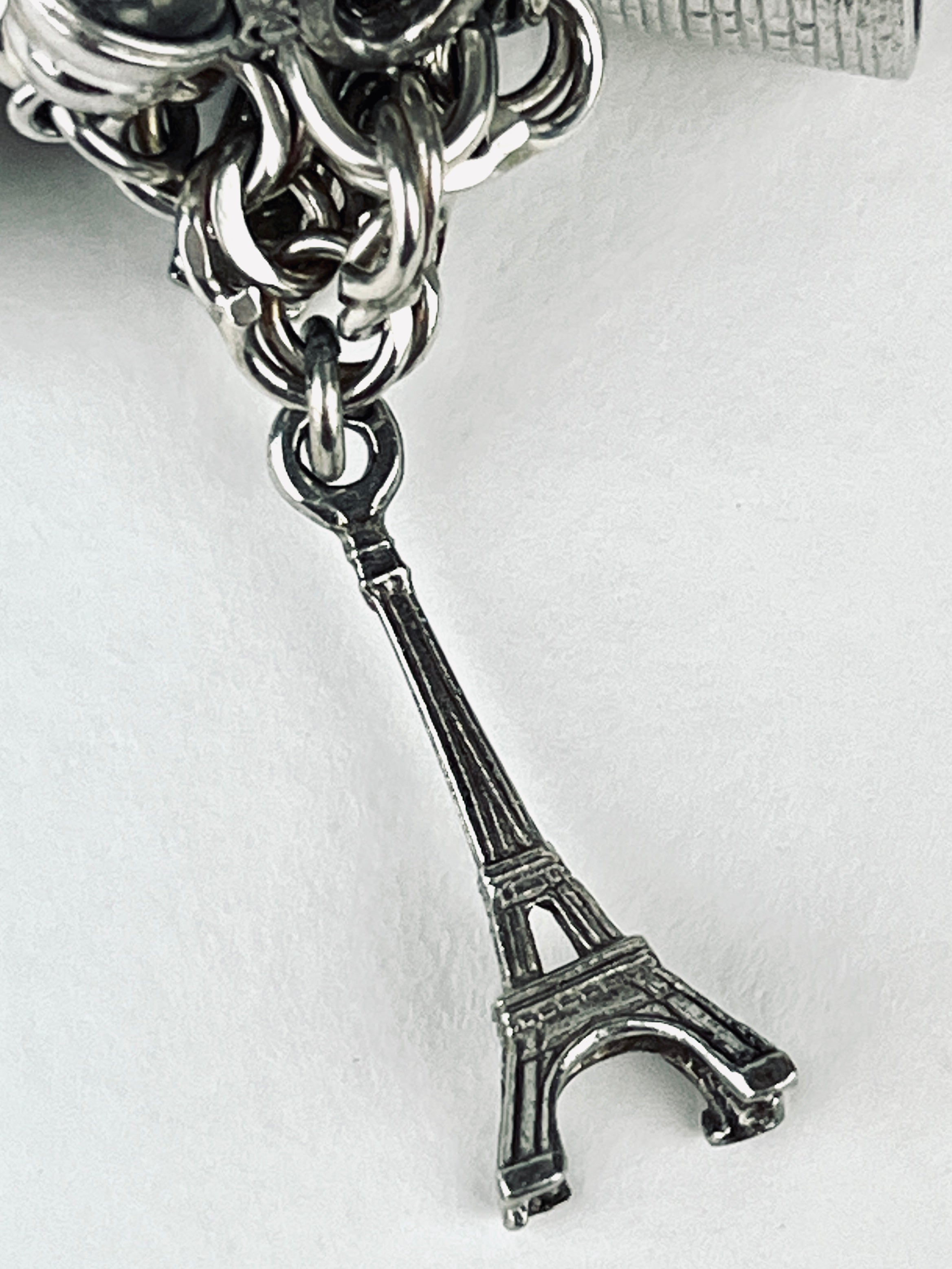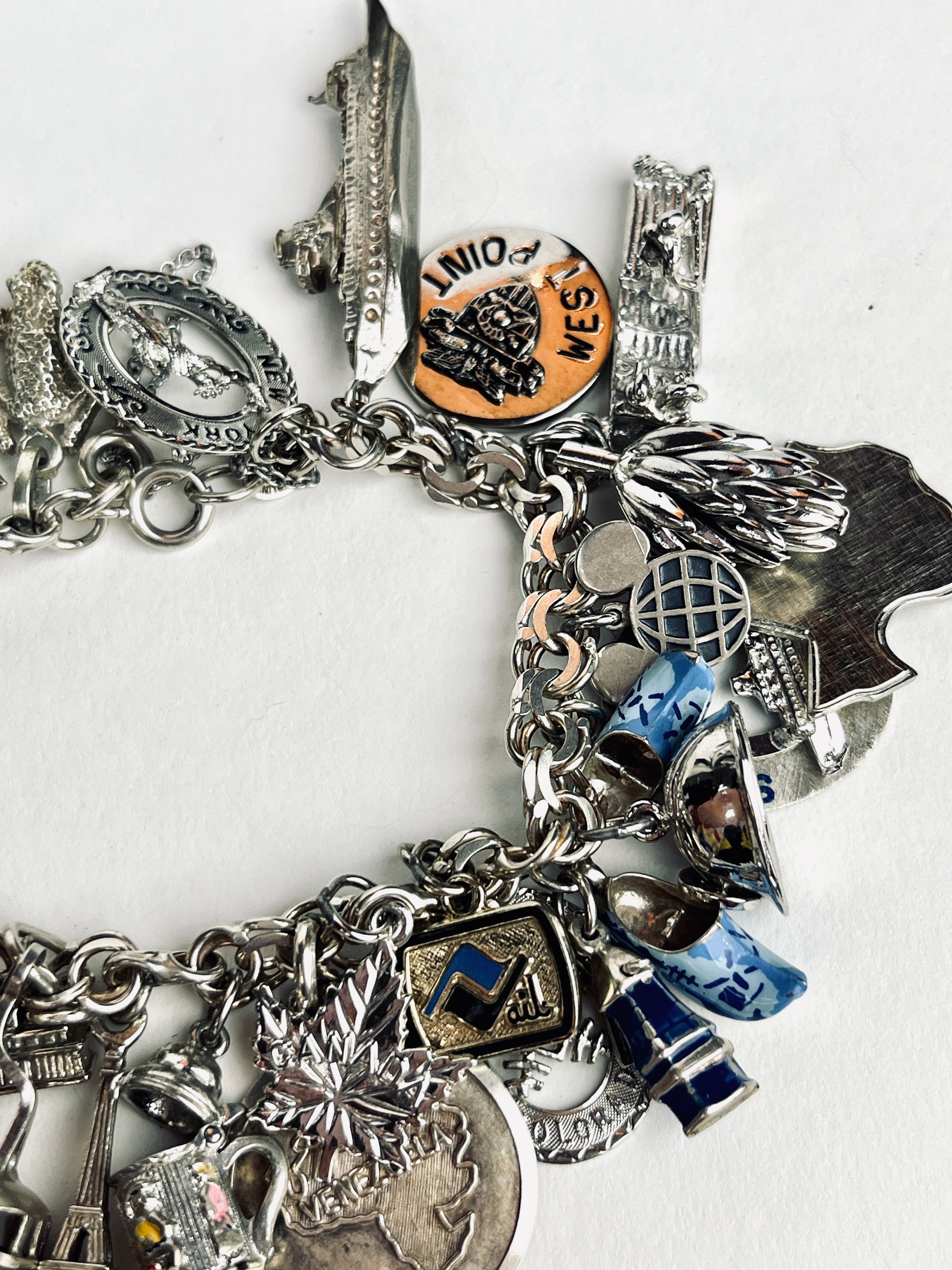 Vintage sterling silver bracelet with 30 silver tone charms collected around the world. We love that it has a safety clasp for added loss prevention.